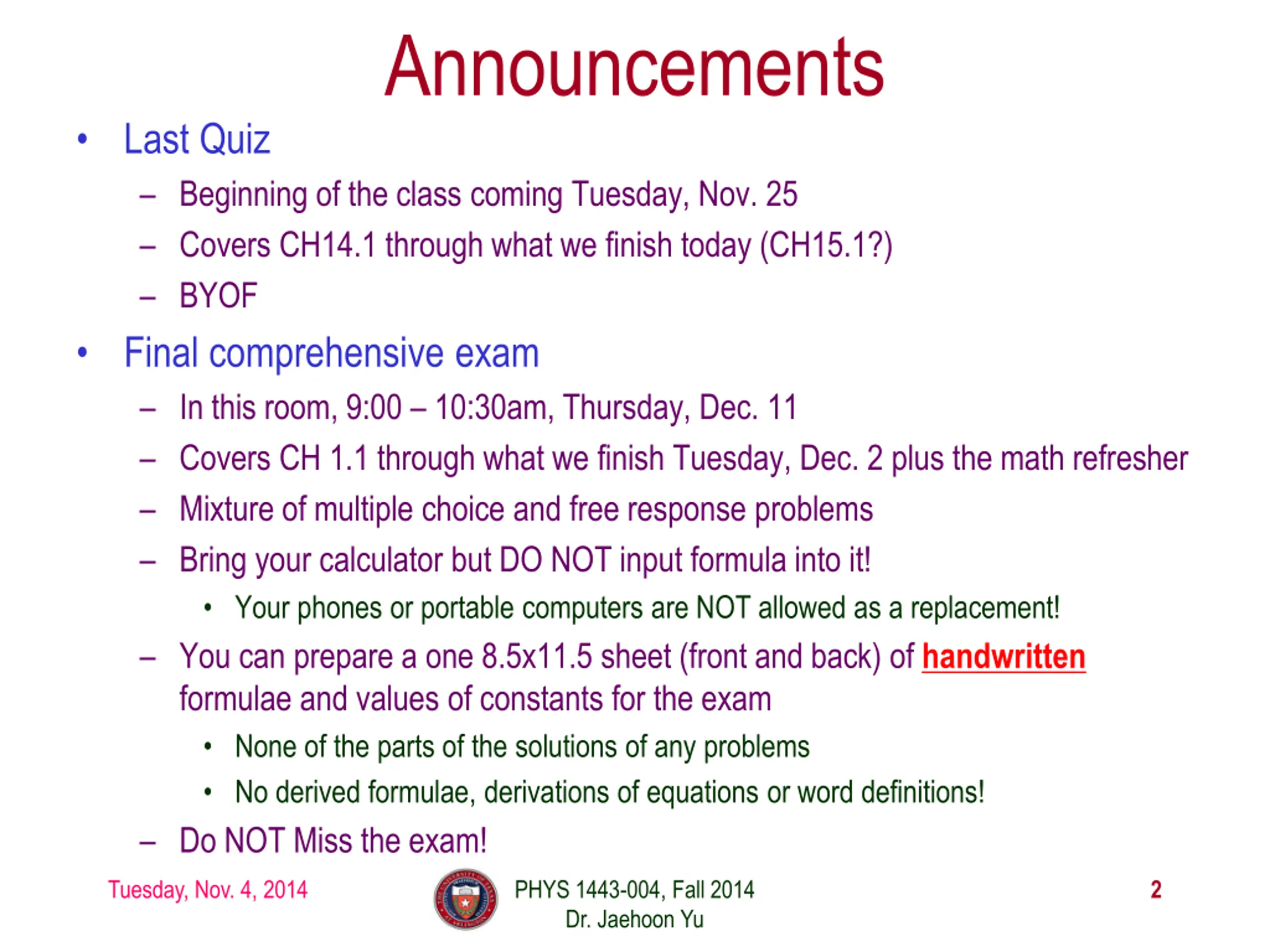 Announcements Last Quiz Beginning of the class coming Tuesday, Nov. 25 Covers CH14.1 through what we finish today (CH15.1?) BYOF Final comprehensive exam In this room, 9:00 10:30am, Thursday, Dec. 11 Covers CH 1.1 through what we finish Tuesday, Dec. 2 plus the math refresher Mixture of multiple choice and free response problems Bring your calculator but DO NOT input formula into it! Your phones or portable computers are NOT allowed as a replacement! You can prepare a one 8.5x11.5 sheet (front and back) of handwritten formulae and values of constants for the exam None of the parts of the solutions of any problems No derived formulae, derivations of equations or word definitions! Do NOT Miss the exam! Tuesday, Nov. 4, 2014 PHYS 1443-004, Fall 2014 Dr. Jaehoon Yu 2