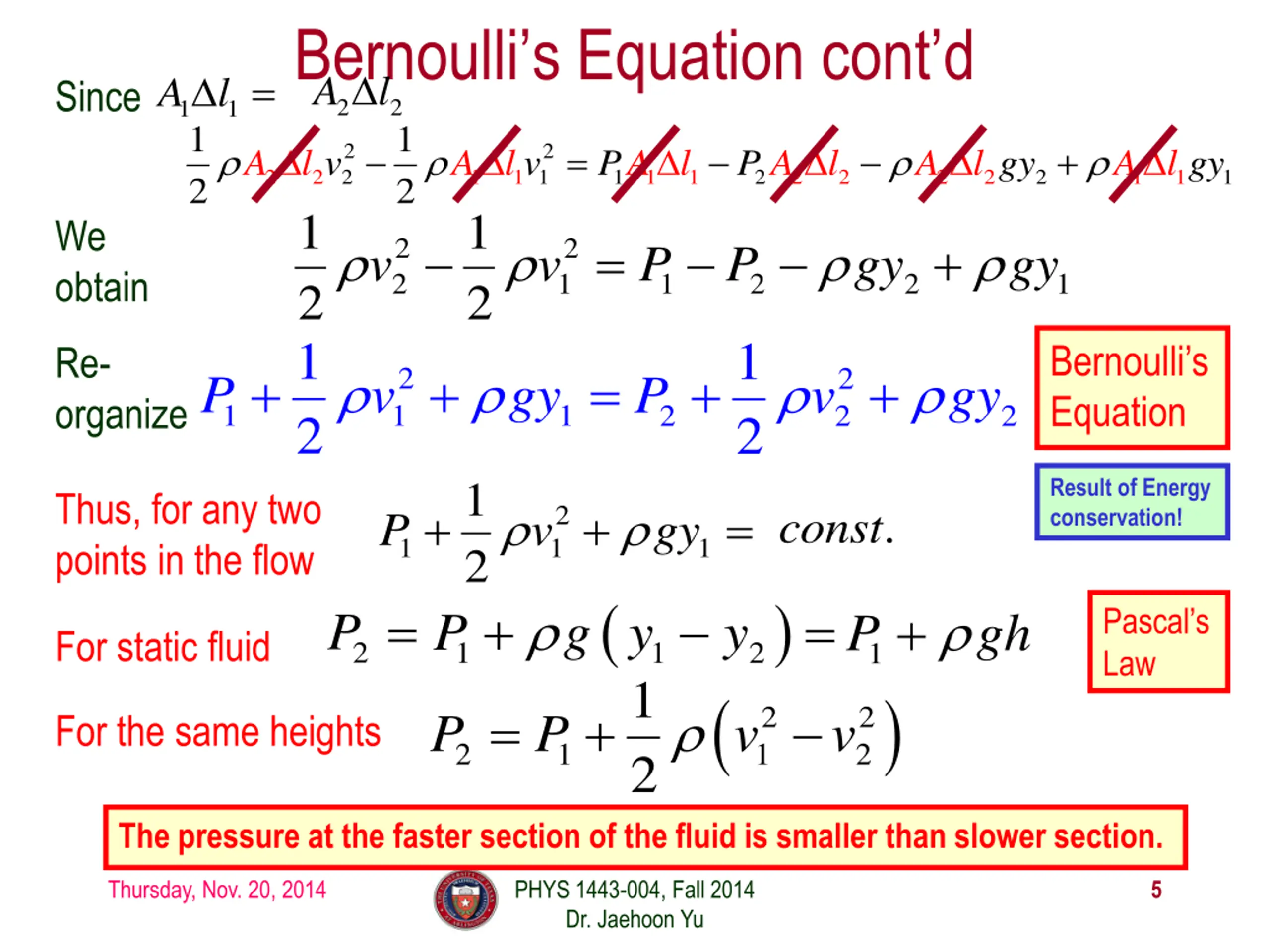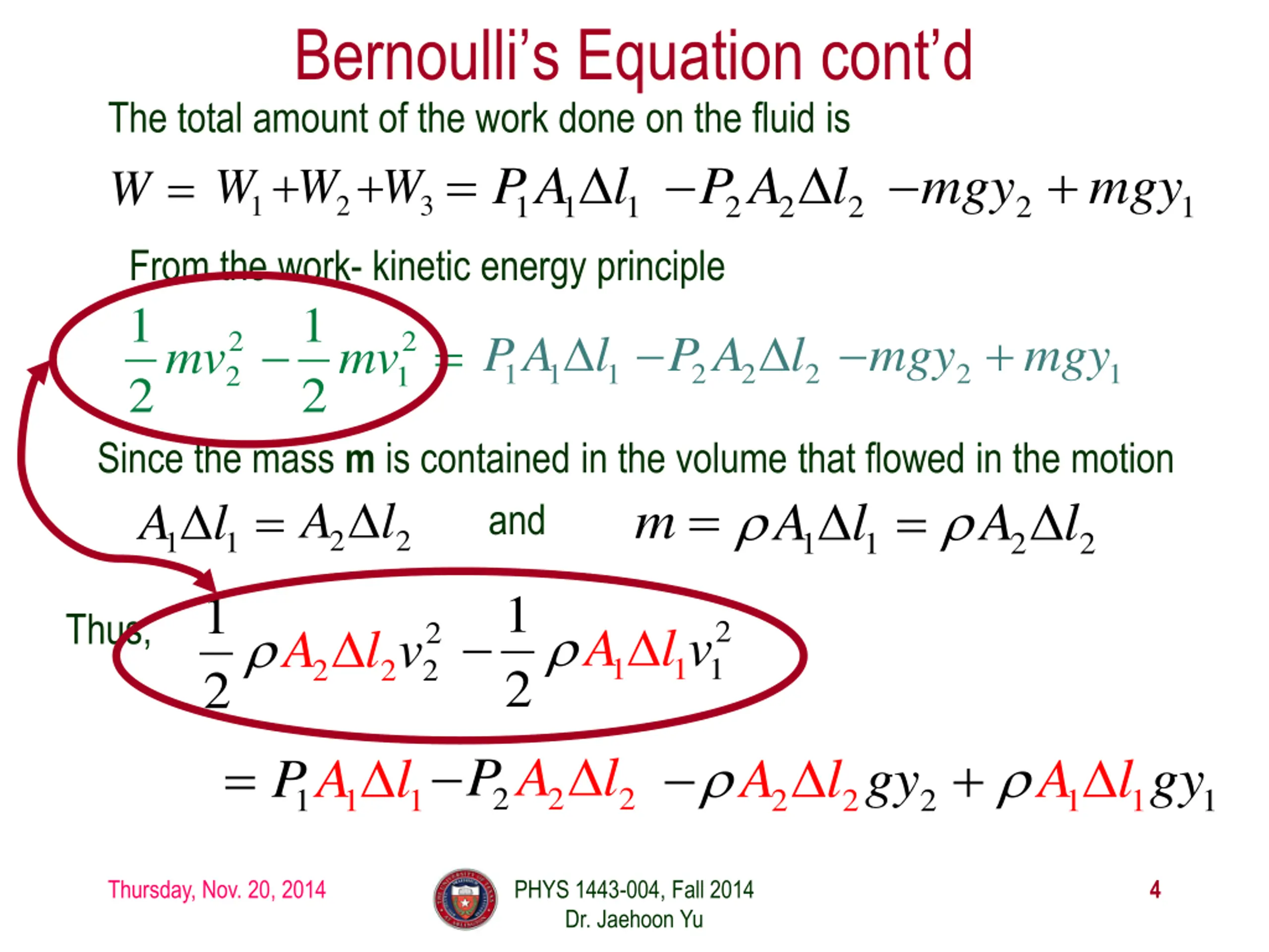 Bernoullis Equation contd The total amount of the work done on the fluid is W = 1 PA l = From the work- kinetic energy principle 1 2mv Since the mass m is contained in the volume that flowed in the motion A l = and m = 2 2 A l 1 2 l P A + + + P A l mgy mgy W W W 1 1 2 2 2 2 1 2 3 1 1 2mv + = 2 2 2 1 P A l mgy mgy PA l 2 2 2 2 1 1 1 1 A l = A l 1 1 1 1 2 2 1 2 Thus, A l 2 1 A l v 2 v 1 1 2 2 2 = A l + A l gy PA l gy 2 2 2 1 1 1 2 2 2 1 1 1 Thursday, Nov. 20, 2014 PHYS 1443-004, Fall 2014 Dr. Jaehoon Yu 4