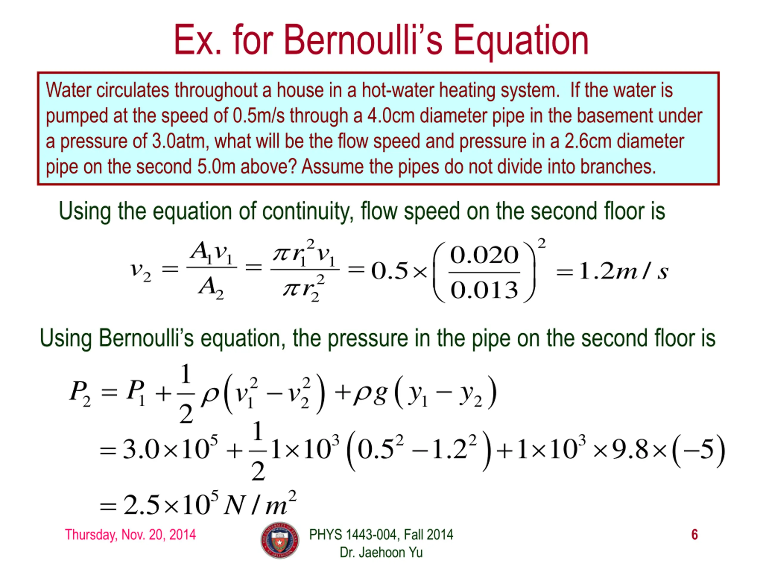 Ex. for Bernoullis Equation Water circulates throughout a house in a hot-water heating system. If the water is pumped at the speed of 0.5m/s through a 4.0cm diameter pipe in the basement under a pressure of 3.0atm, what will be the flow speed and pressure in a 2.6cm diameter pipe on the second 5.0m above? Assume the pipes do not divide into branches. Using the equation of continuity, flow speed on the second floor is Av A 2 r 2 2 r v 0.020 0.013 = 2 v = = 1 1 1 1 = 0.5 1.2 / m s 2 2 Using Bernoulli s equation, the pressure in the pipe on the second floor is ( 1 2 2 1 ) ( ) g y + 2 P = + 2 2 1P y v v 1 2 1 2 / ( ) ( ) = 3.0 10 + 1 10 0.5 1 10 + 5 3 2 2 3 1.2 9.8 5 = 2.5 10 5 2 N m Thursday, Nov. 20, 2014 PHYS 1443-004, Fall 2014 Dr. Jaehoon Yu 6