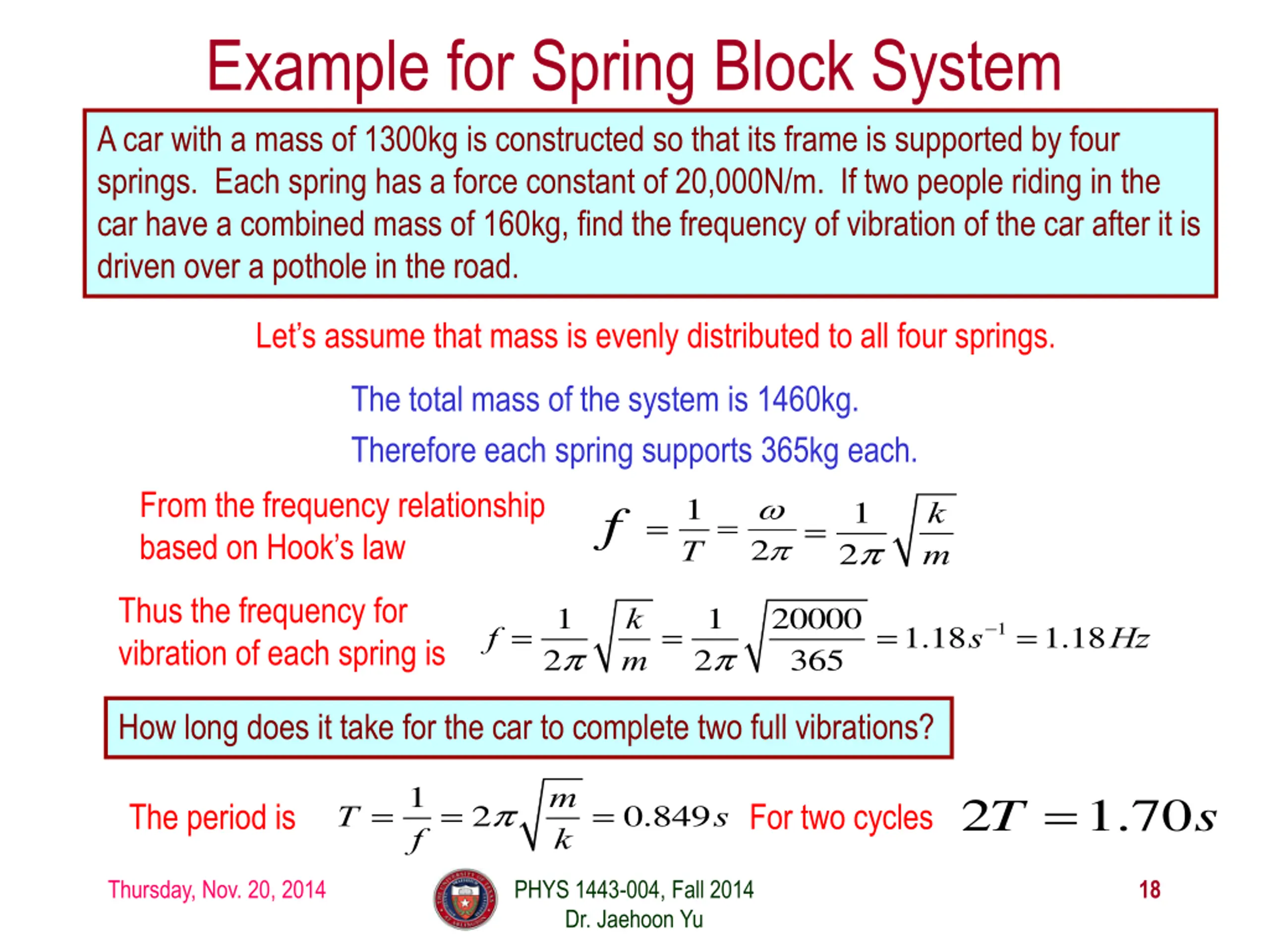 Example for Spring Block System A car with a mass of 1300kg is constructed so that its frame is supported by four springs. Each spring has a force constant of 20,000N/m. If two people riding in the car have a combined mass of 160kg, find the frequency of vibration of the car after it is driven over a pothole in the road. Let s assume that mass is evenly distributed to all four springs. The total mass of the system is 1460kg. Therefore each spring supports 365kg each. From the frequency relationship based on Hook s law =1 1 k m f = = 2 2p T Thus the frequency for vibration of each spring is 1 1 20000 365 k m= =1.18s-1=1.18Hz f = 2p 2p How long does it take for the car to complete two full vibrations? T =1 m k= 0.849s For two cycles . 1 = 2 70 T s The period is f= 2p Thursday, Nov. 20, 2014 PHYS 1443-004, Fall 2014 Dr. Jaehoon Yu 18
