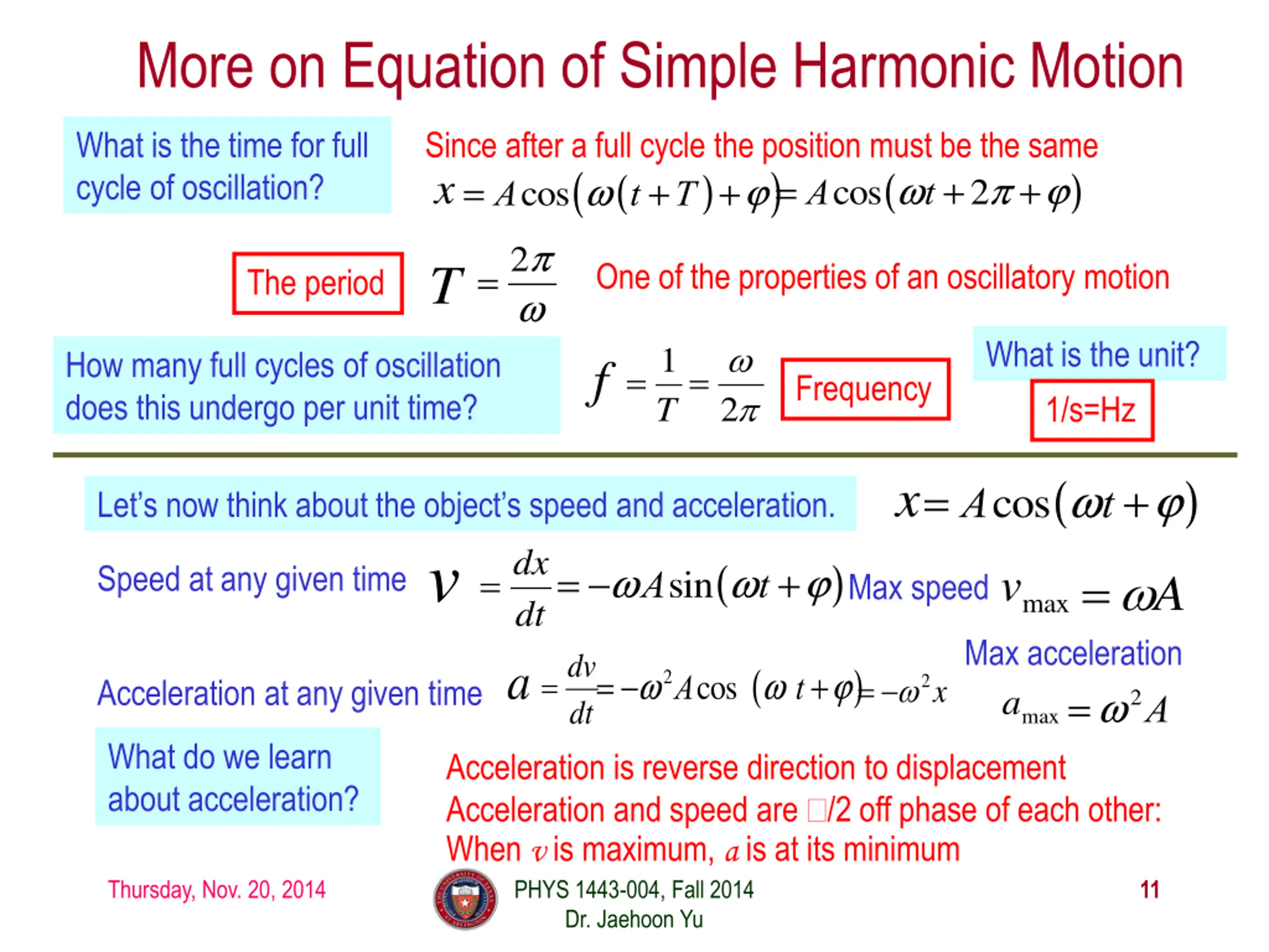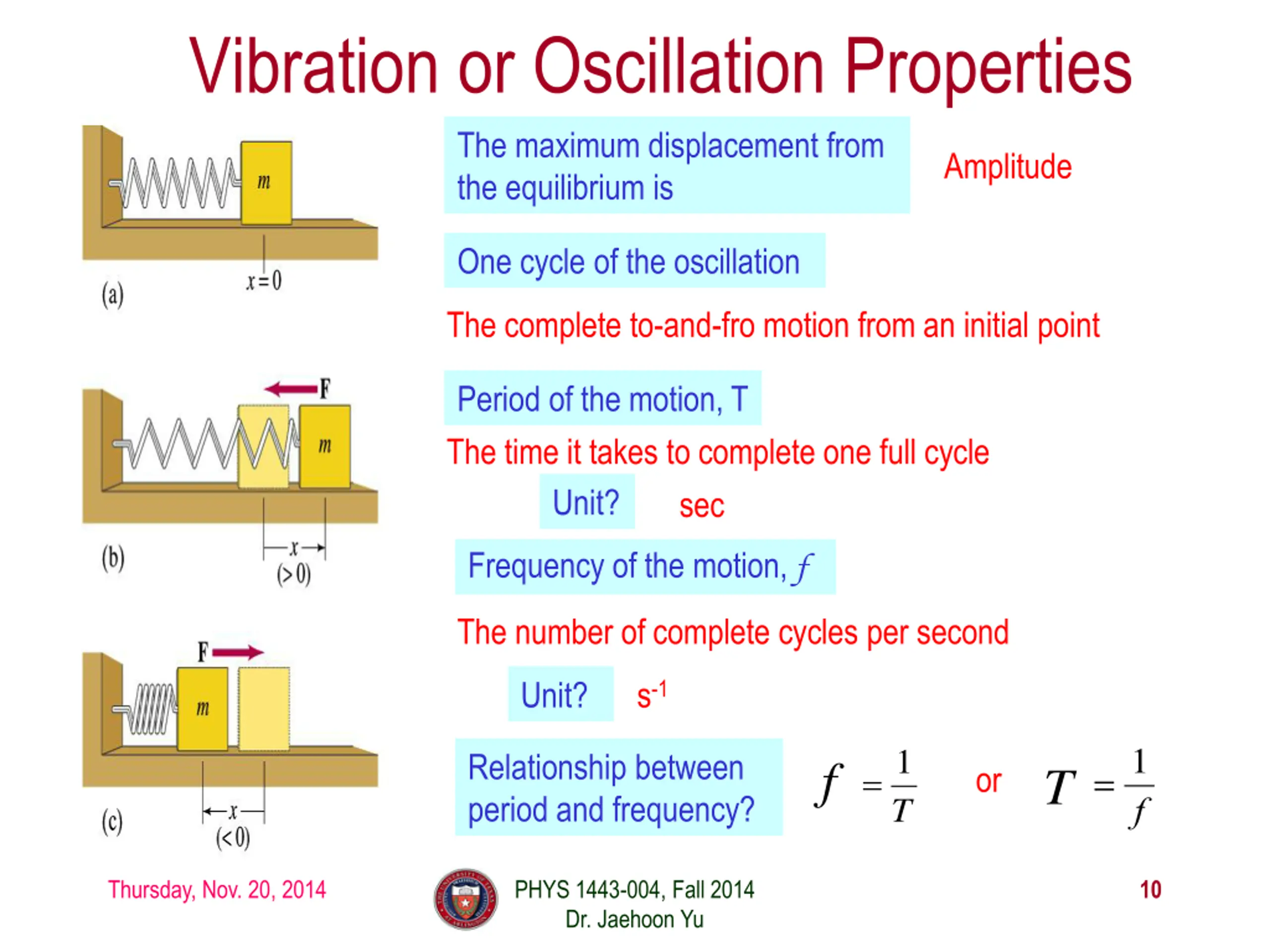 Vibration or Oscillation Properties The maximum displacement from the equilibrium is Amplitude One cycle of the oscillation The complete to-and-fro motion from an initial point Period of the motion, T The time it takes to complete one full cycle Unit? sec Frequency of the motion, f The number of complete cycles per second Unit? s-1 =1 1 Relationship between period and frequency? f T or = f T Thursday, Nov. 20, 2014 PHYS 1443-004, Fall 2014 Dr. Jaehoon Yu 10