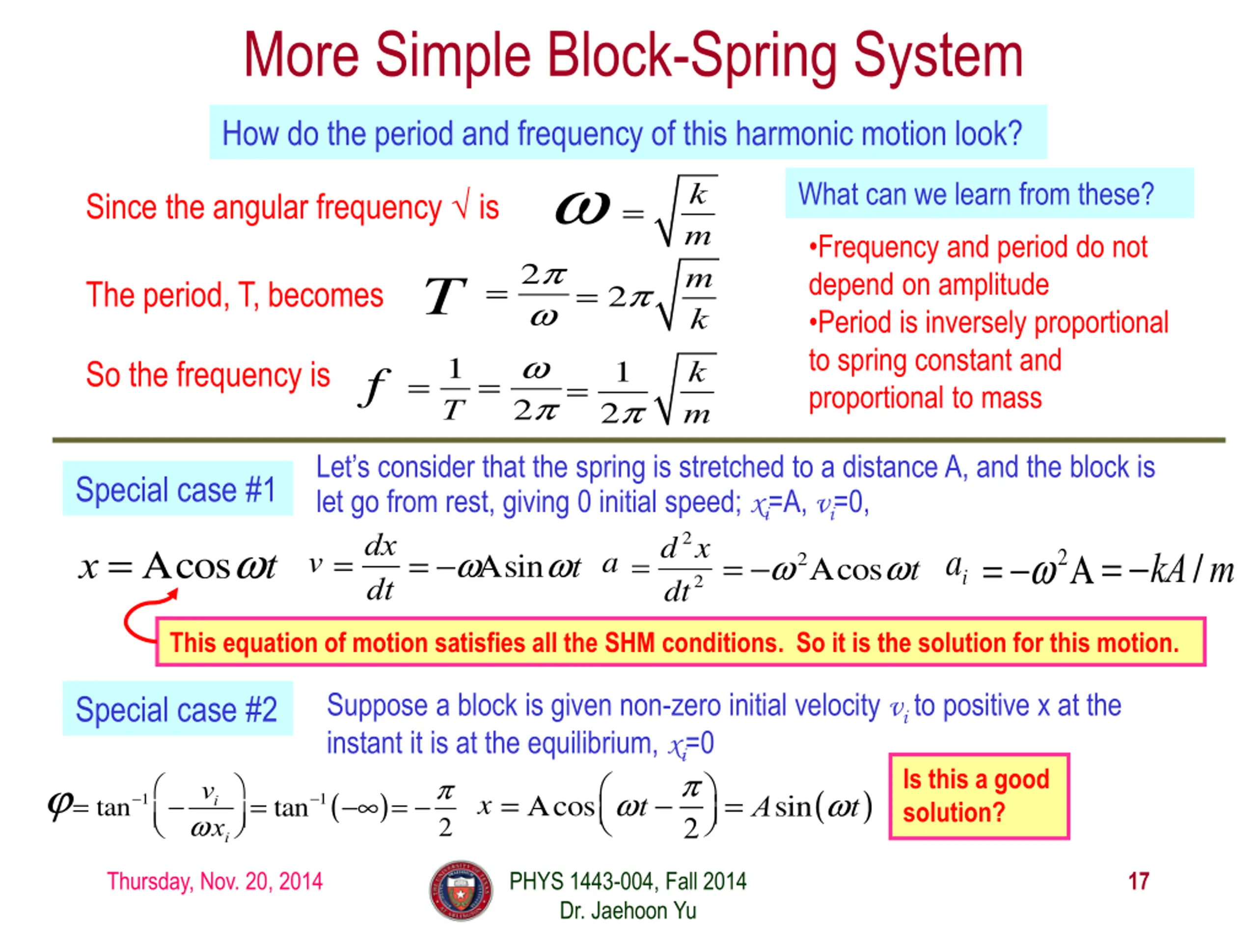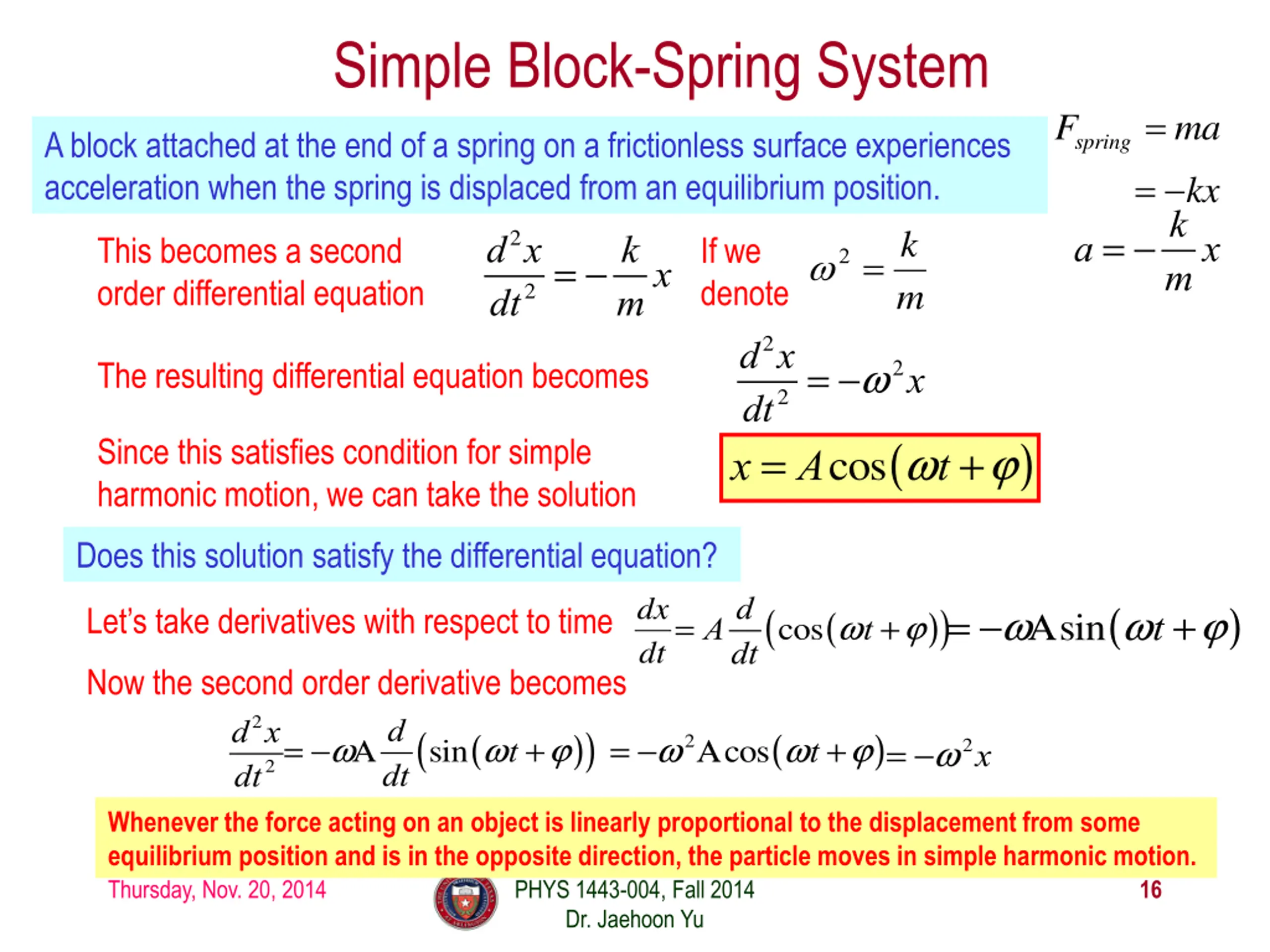 Simple Block-Spring System = = spring F ma A block attached at the end of a spring on a frictionless surface experiences acceleration when the spring is displaced from an equilibrium position. d2x dt2= -k kx a = -k k mx This becomes a second order differential equation If we denote d2x dt2= -w2x = mx m The resulting differential equation becomes ( ) Since this satisfies condition for simple harmonic motion, we can take the solution x = Acos wt +j Does this solution satisfy the differential equation? = Ad dx ( ) ( )= -wAsin wt +j cos wt +j ( ) Let s take derivatives with respect to time dt dt Now the second order derivative becomes d2x dt2 Whenever the force acting on an object is linearly proportional to the displacement from some equilibrium position and is in the opposite direction, the particle moves in simple harmonic motion. = -wAd ( ) = -w2Acos wt +j ( )= -w2x sin wt +j ( ) dt Thursday, Nov. 20, 2014 PHYS 1443-004, Fall 2014 Dr. Jaehoon Yu 16