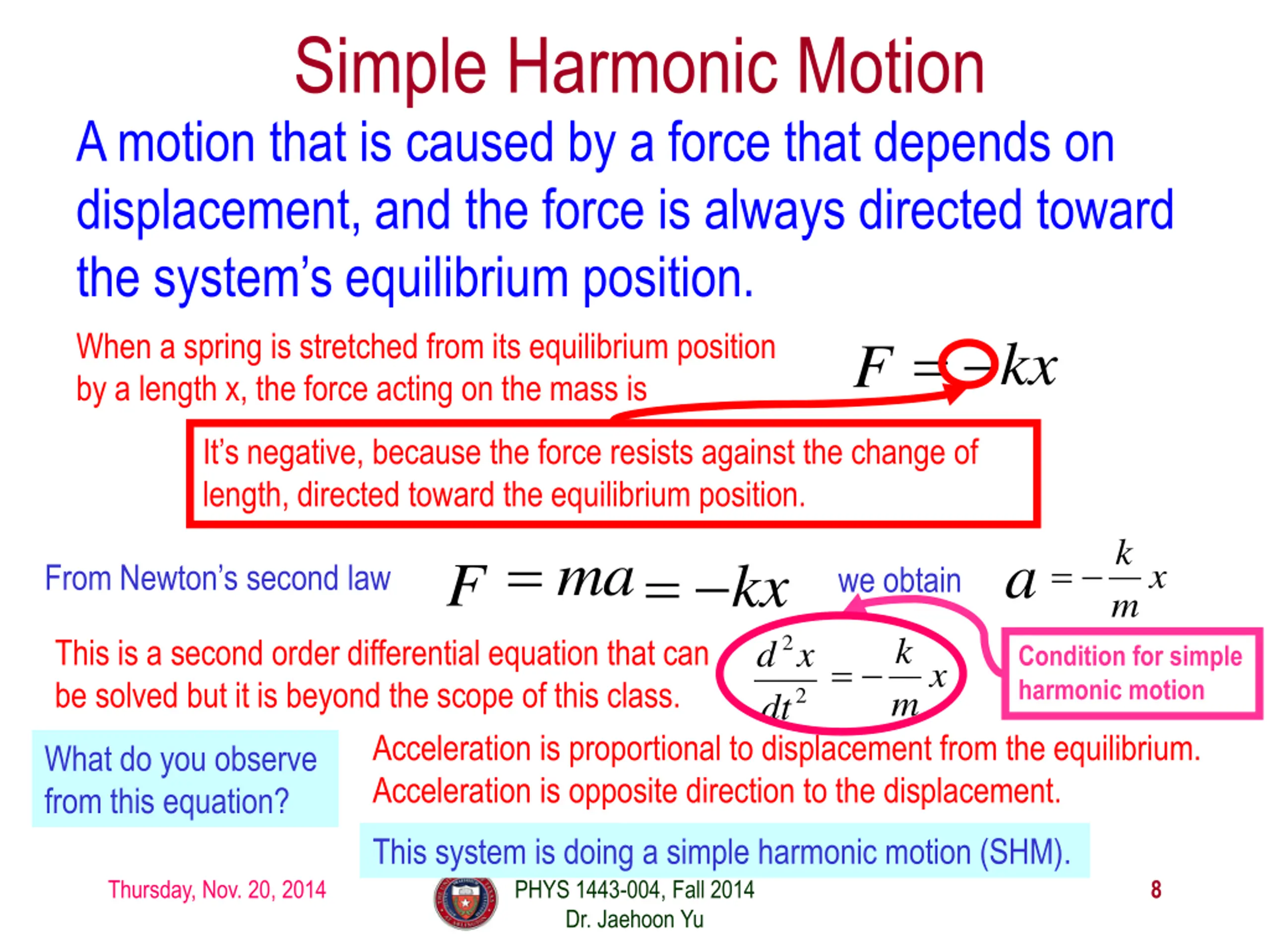 Simple Harmonic Motion A motion that is caused by a force that depends on displacement, and the force is always directed toward the system s equilibrium position. When a spring is stretched from its equilibrium position by a length x, the force acting on the mass is = kx F It s negative, because the force resists against the change of length, directed toward the equilibrium position. ma = k we obtain a k = = F = kx d x From Newton s second law m 2 This is a second order differential equation that can be solved but it is beyond the scope of this class. Acceleration is proportional to displacement from the equilibrium. Acceleration is opposite direction to the displacement. x Condition for simple harmonic motion x m 2 dt What do you observe from this equation? This system is doing a simple harmonic motion (SHM). Thursday, Nov. 20, 2014 PHYS 1443-004, Fall 2014 Dr. Jaehoon Yu 8