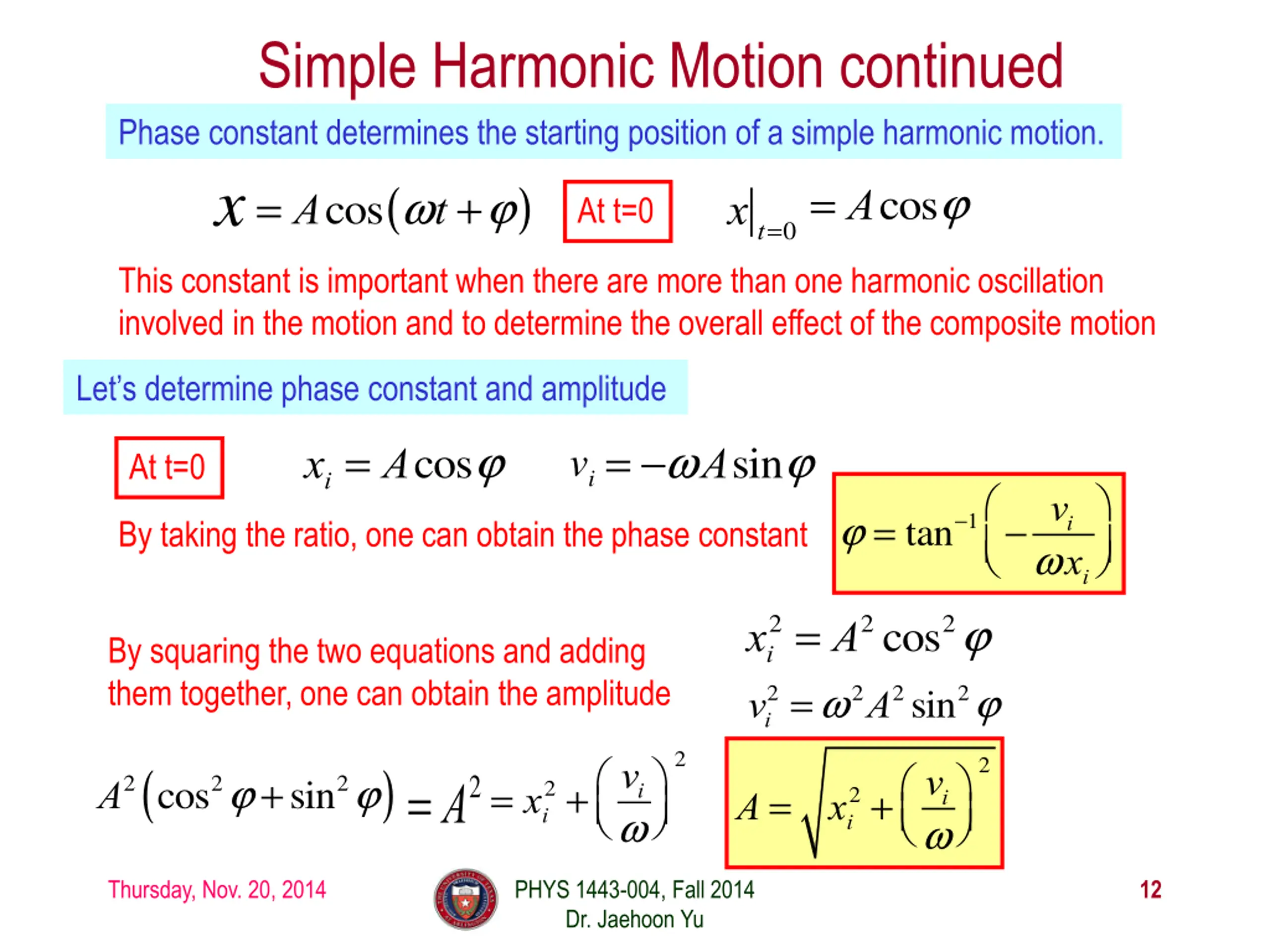 Simple Harmonic Motion continued Phase constant determines the starting position of a simple harmonic motion. x At t=0 = Acos wt +j ( ) = Acosj xt=0 This constant is important when there are more than one harmonic oscillation involved in the motion and to determine the overall effect of the composite motion Let s determine phase constant and amplitude = -wAsinj xi= Acosj iv At t=0 j = tan-1-vi By taking the ratio, one can obtain the phase constant wxi 2= A2cos2j xi vi By squaring the two equations and adding them together, one can obtain the amplitude 2=w2A2sin2j 2 A2cos2j +sin2j ( ) 2 vi w vi w = A2= xi 2+ A = 2+ xi Thursday, Nov. 20, 2014 PHYS 1443-004, Fall 2014 Dr. Jaehoon Yu 12