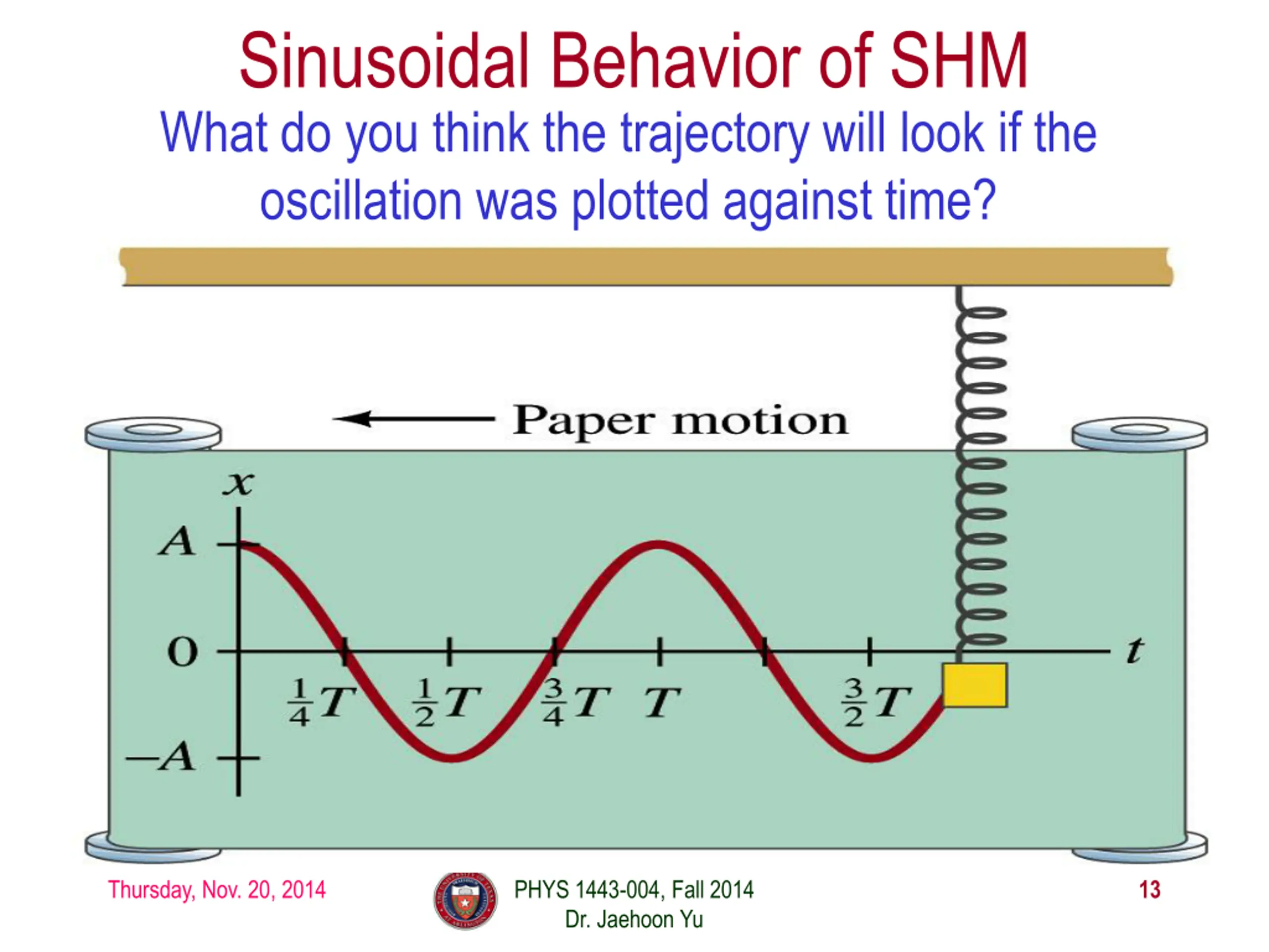 Sinusoidal Behavior of SHM What do you think the trajectory will look if the oscillation was plotted against time? Thursday, Nov. 20, 2014 PHYS 1443-004, Fall 2014 Dr. Jaehoon Yu 13