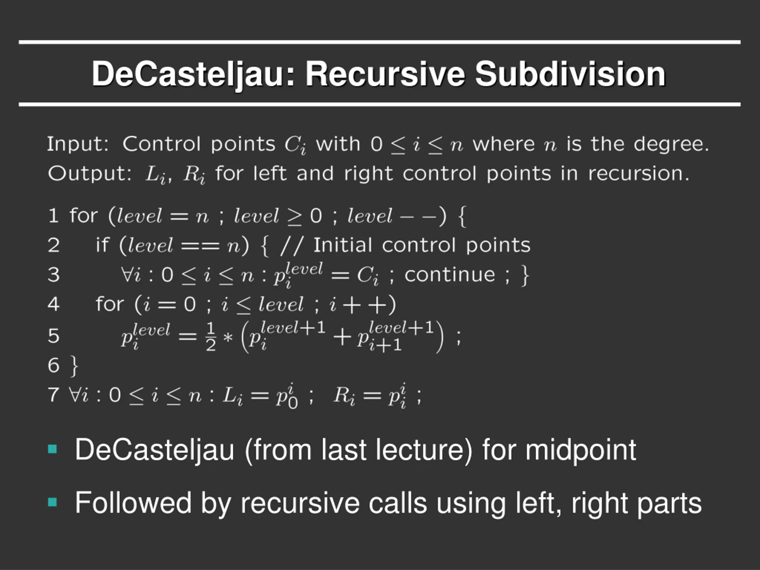 DeCasteljau: Recursive Subdivision DeCasteljau (from last lecture) for midpoint Followed by recursive calls using left, right parts