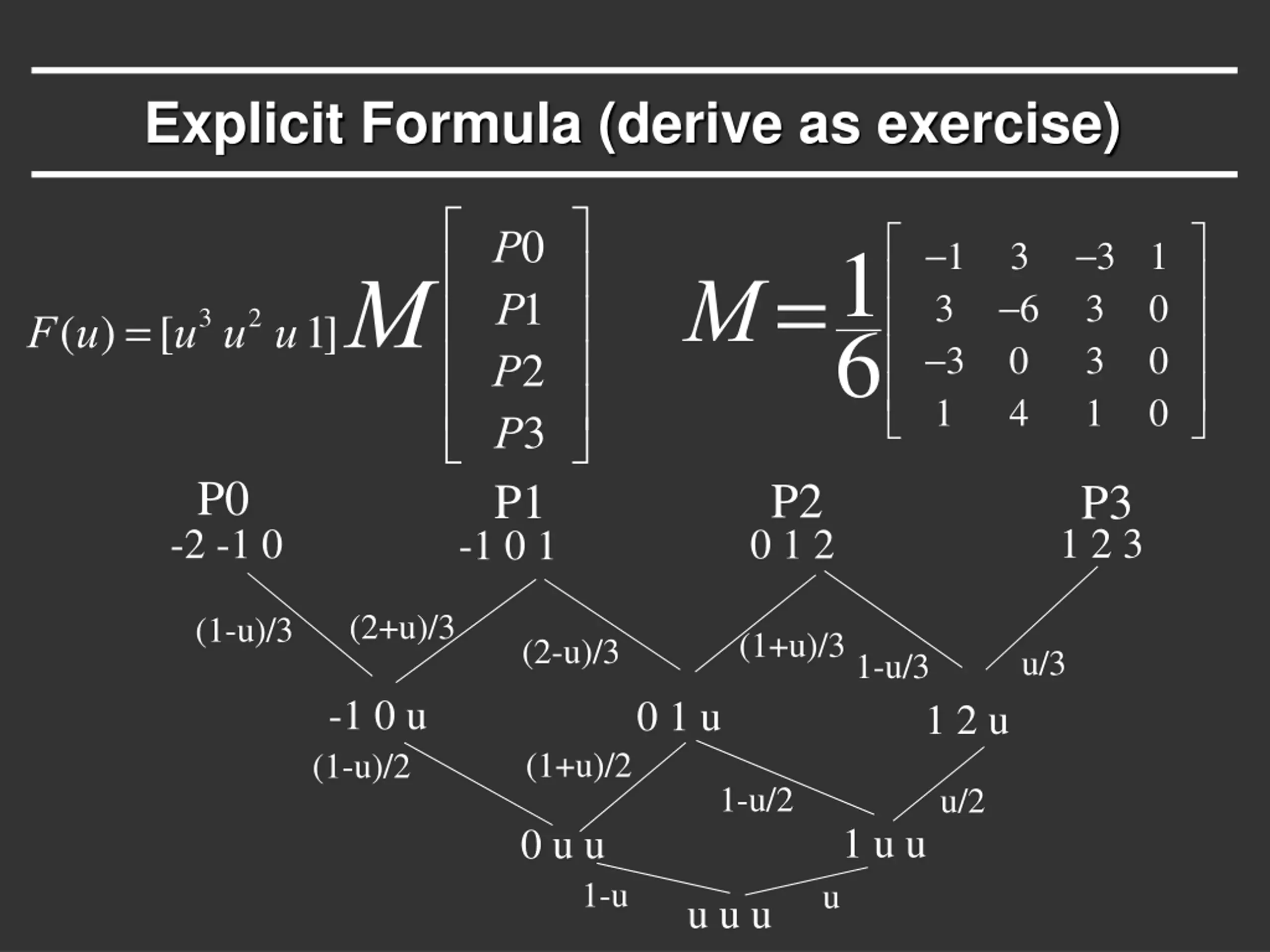 Explicit Formula (derive as exercise) P0 P1 P2 P3 P1 -1 3 -3 1 -3 1 3 3 1 M=1 3 F(u) =[u3u2u1]M -6 0 4 0 0 0 6 P0 P2 P3 1 2 3 -2 -1 0 0 1 2 -1 0 1 (2+u)/3 (1-u)/3 (1+u)/3 (2-u)/3 u/3 1-u/3 -1 0 u (1-u)/2 0 1 u 1 2 u (1+u)/2 1-u/2 u/2 1 u u 0 u u 1-u u u u u