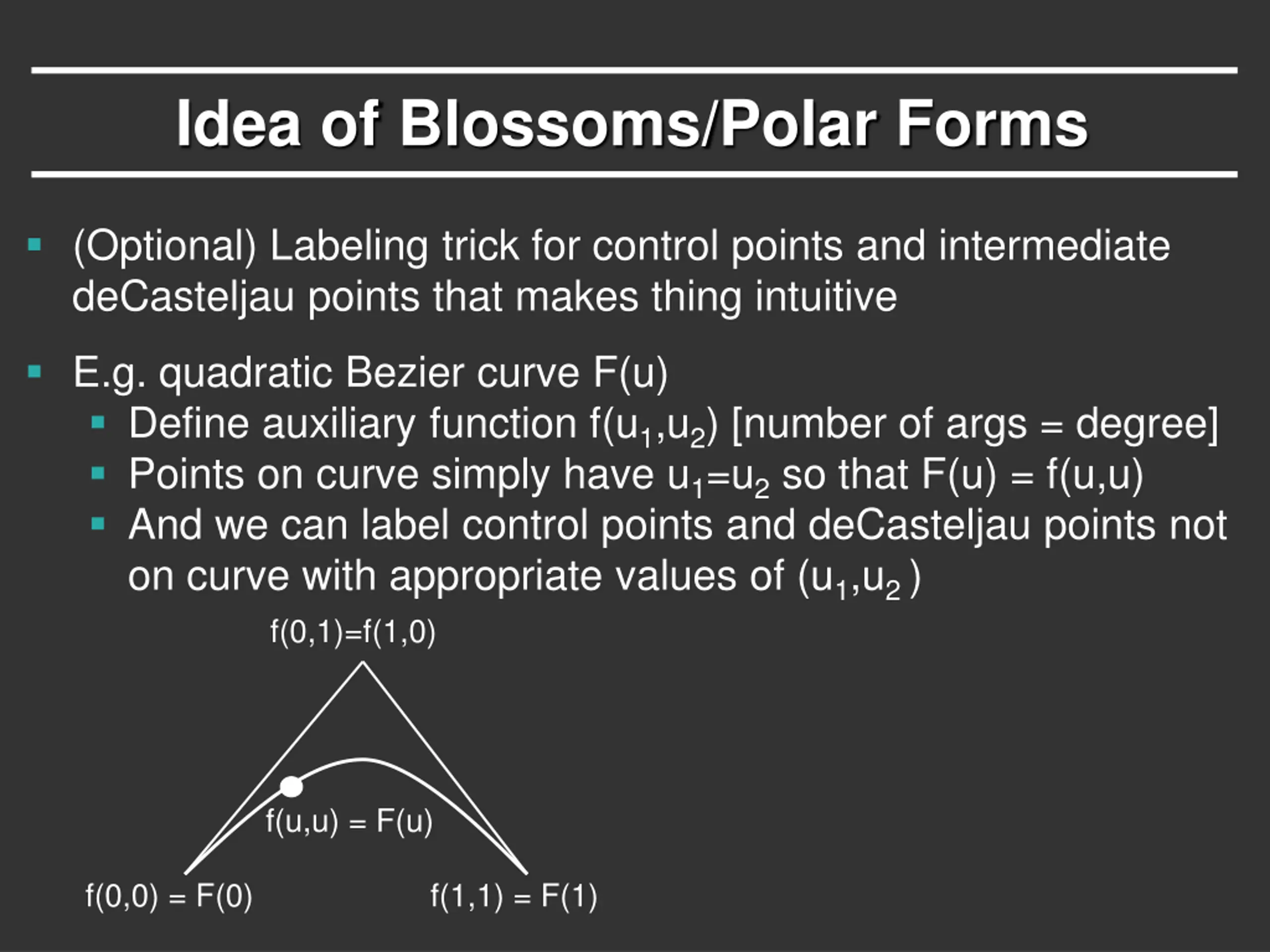 Idea of Blossoms/Polar Forms (Optional) Labeling trick for control points and intermediate deCasteljau points that makes thing intuitive E.g. quadratic Bezier curve F(u) Define auxiliary function f(u1,u2) [number of args = degree] Points on curve simply have u1=u2 so that F(u) = f(u,u) And we can label control points and deCasteljau points not on curve with appropriate values of (u1,u2 ) f(0,1)=f(1,0) f(u,u) = F(u) f(0,0) = F(0) f(1,1) = F(1)