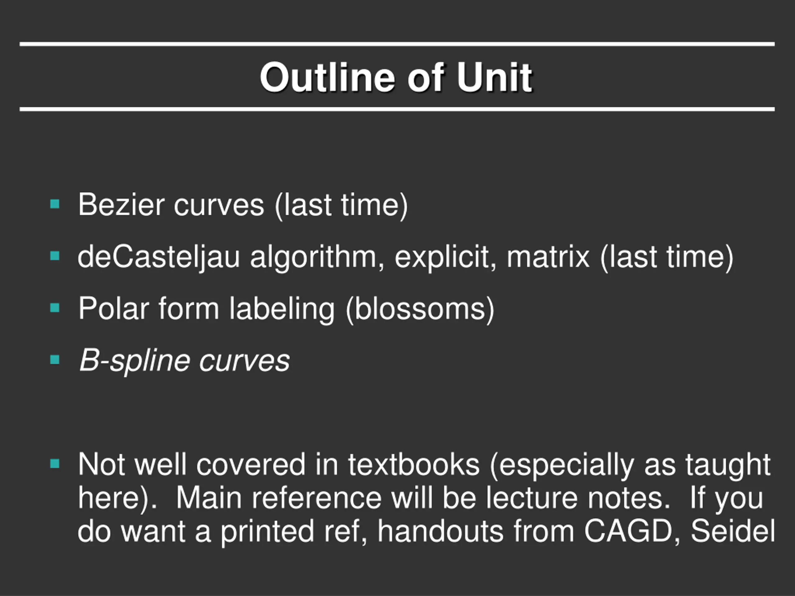 Outline of Unit Bezier curves (last time) deCasteljau algorithm, explicit, matrix (last time) Polar form labeling (blossoms) B-spline curves Not well covered in textbooks (especially as taught here). Main reference will be lecture notes. If you do want a printed ref, handouts from CAGD, Seidel