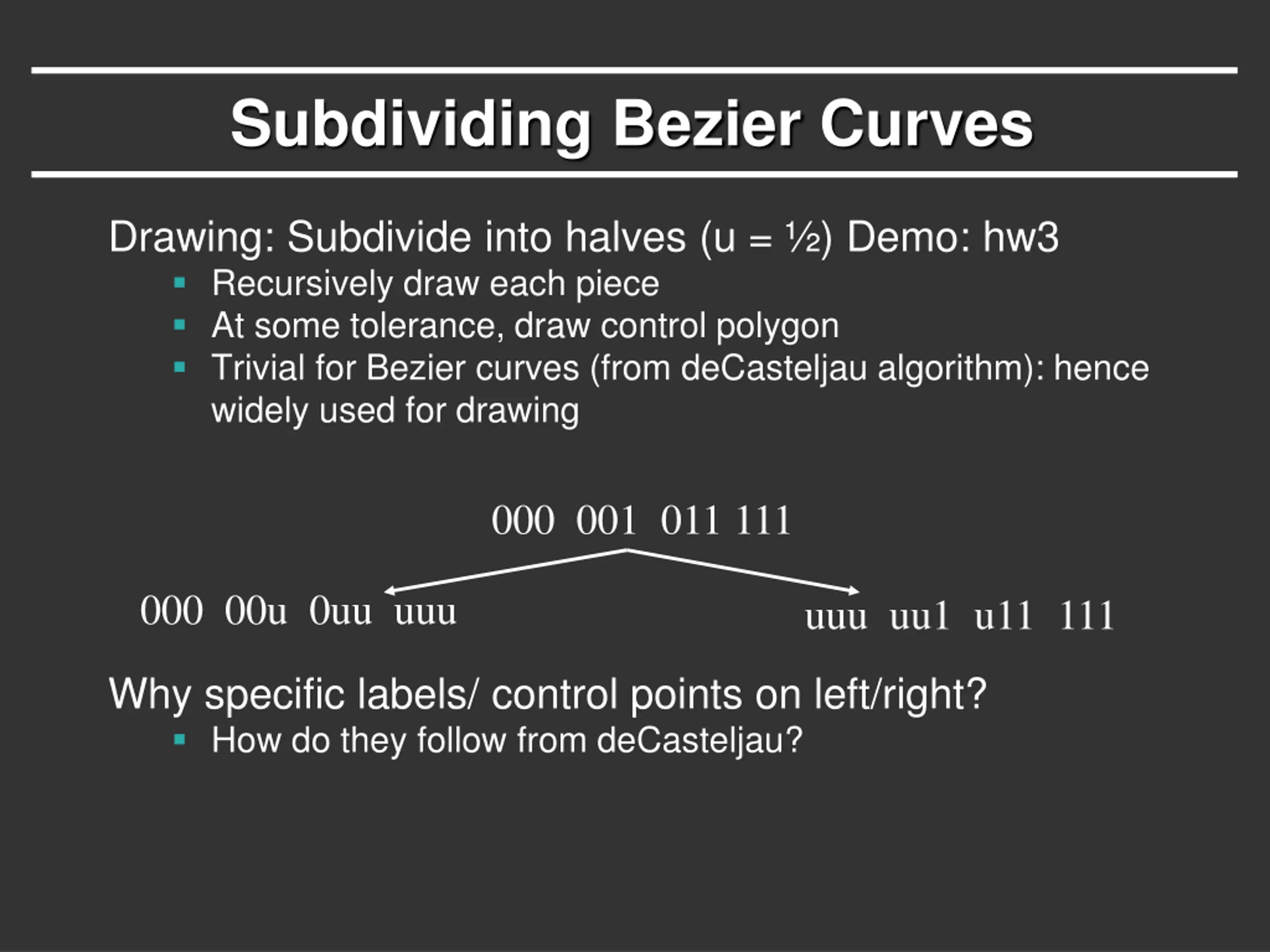 Subdividing Bezier Curves Drawing: Subdivide into halves (u = ) Demo: hw3 Recursively draw each piece At some tolerance, draw control polygon Trivial for Bezier curves (from deCasteljau algorithm): hence widely used for drawing 000 001 011 111 000 00u 0uu uuu uuu uu1 u11 111 Why specific labels/ control points on left/right? How do they follow from deCasteljau?