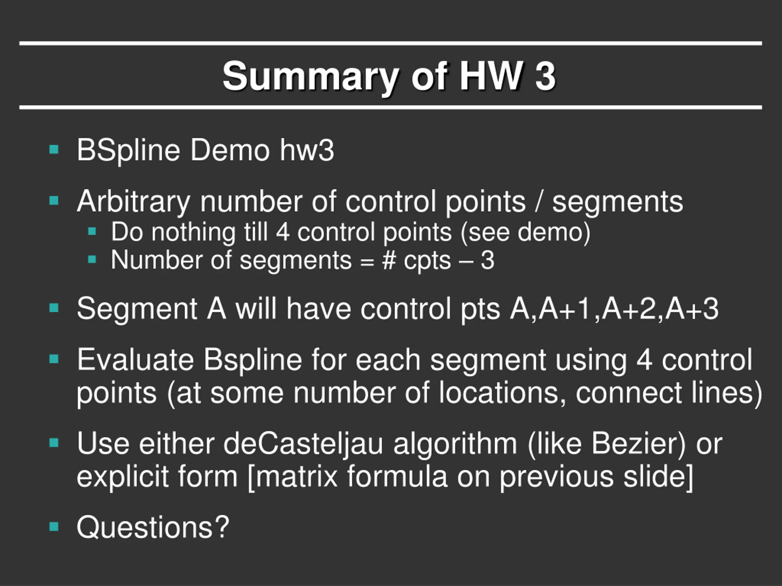 Summary of HW 3 BSpline Demo hw3 Arbitrary number of control points / segments Do nothing till 4 control points (see demo) Number of segments = # cpts 3 Segment A will have control pts A,A+1,A+2,A+3 Evaluate Bspline for each segment using 4 control points (at some number of locations, connect lines) Use either deCasteljau algorithm (like Bezier) or explicit form [matrix formula on previous slide] Questions?