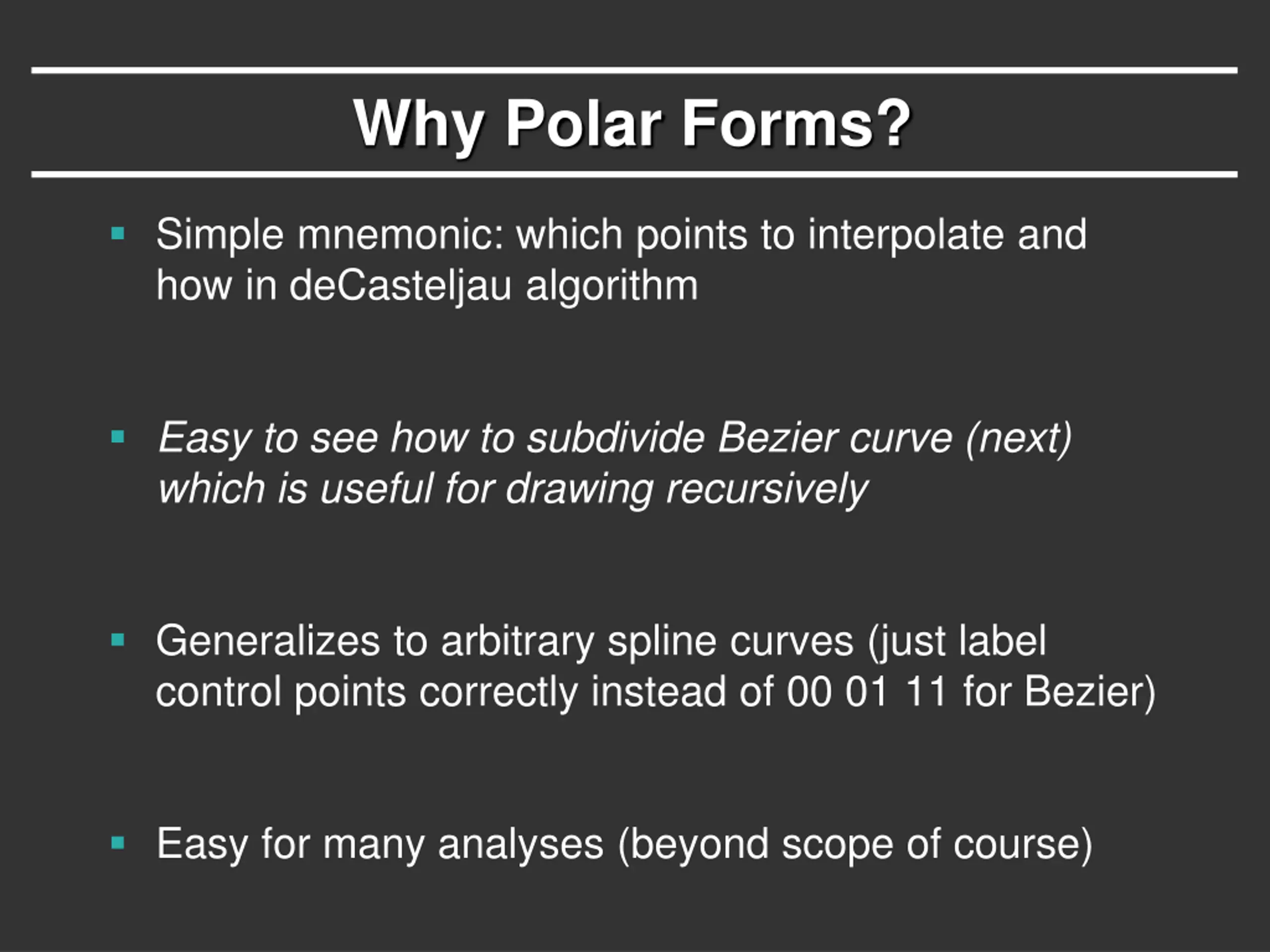 Why Polar Forms? Simple mnemonic: which points to interpolate and how in deCasteljau algorithm Easy to see how to subdivide Bezier curve (next) which is useful for drawing recursively Generalizes to arbitrary spline curves (just label control points correctly instead of 00 01 11 for Bezier) Easy for many analyses (beyond scope of course)