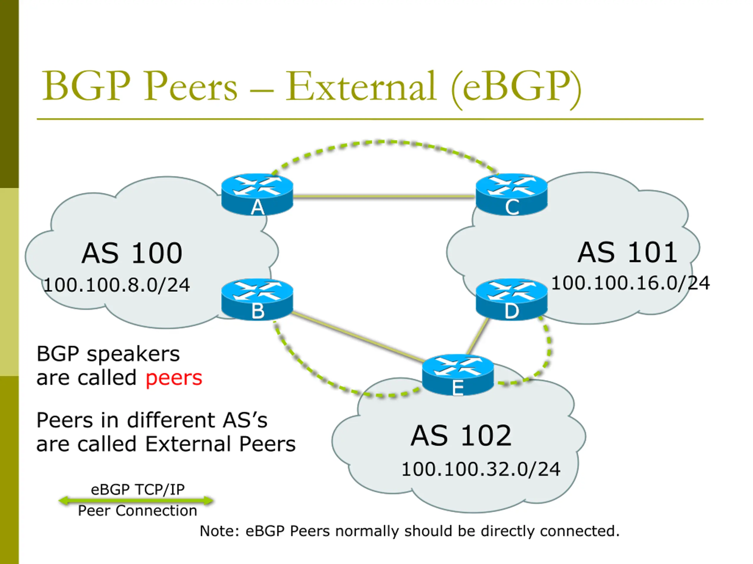 BGP Peers External (eBGP) A C AS 101 100.100.16.0/24 AS 100 100.100.8.0/24 B D BGP speakers are called peers E Peers in different AS s are called External Peers AS 102 100.100.32.0/24 eBGP TCP/IP Peer Connection Note: eBGP Peers normally should be directly connected.