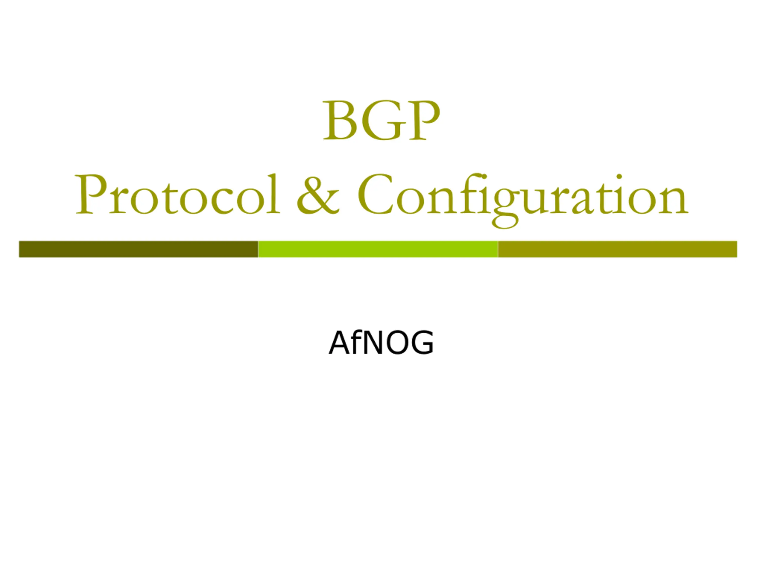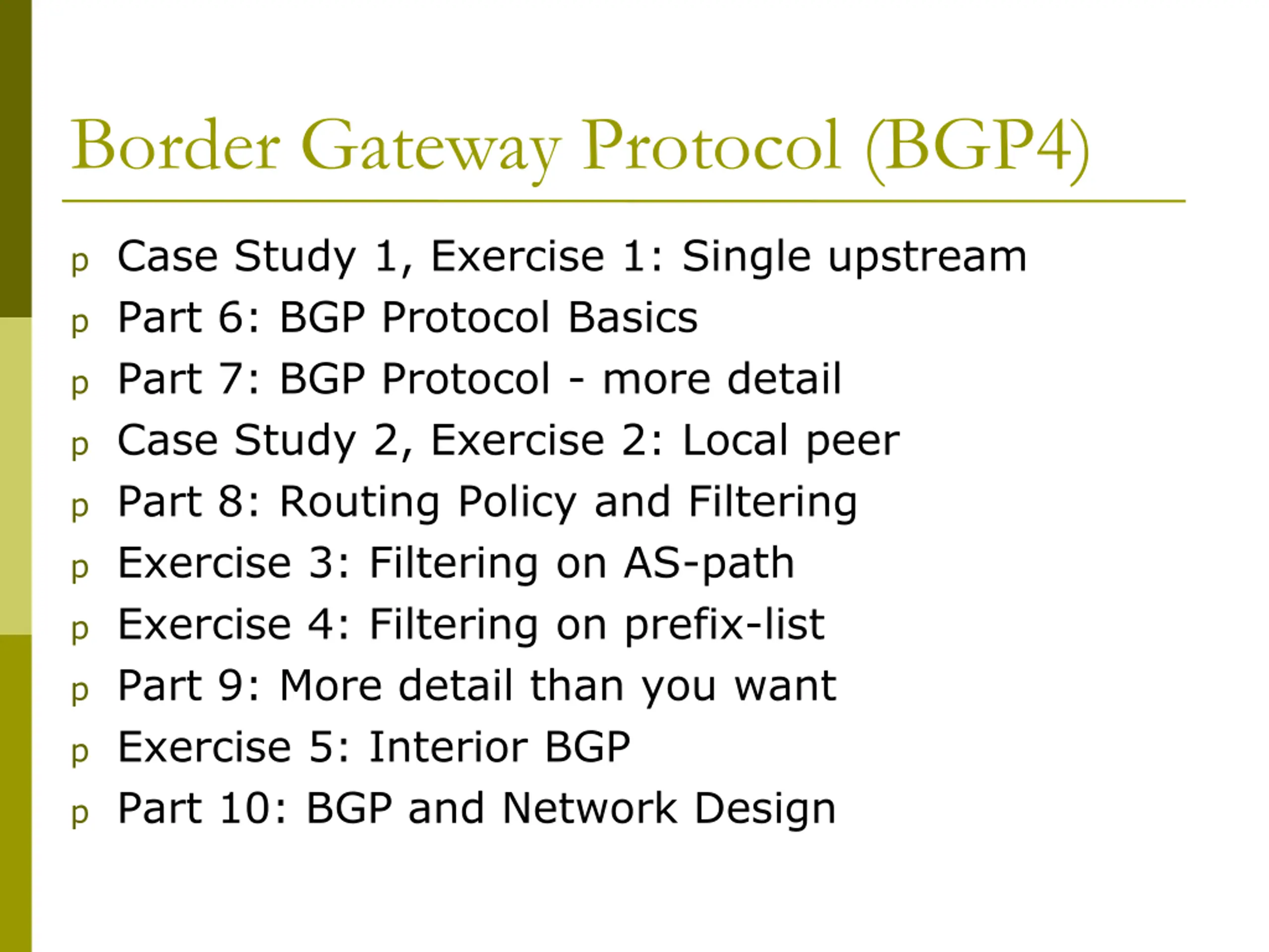 Border Gateway Protocol (BGP4) p Case Study 1, Exercise 1: Single upstream p Part 6: BGP Protocol Basics p Part 7: BGP Protocol - more detail p Case Study 2, Exercise 2: Local peer p Part 8: Routing Policy and Filtering p Exercise 3: Filtering on AS-path p Exercise 4: Filtering on prefix-list p Part 9: More detail than you want p Exercise 5: Interior BGP p Part 10: BGP and Network Design