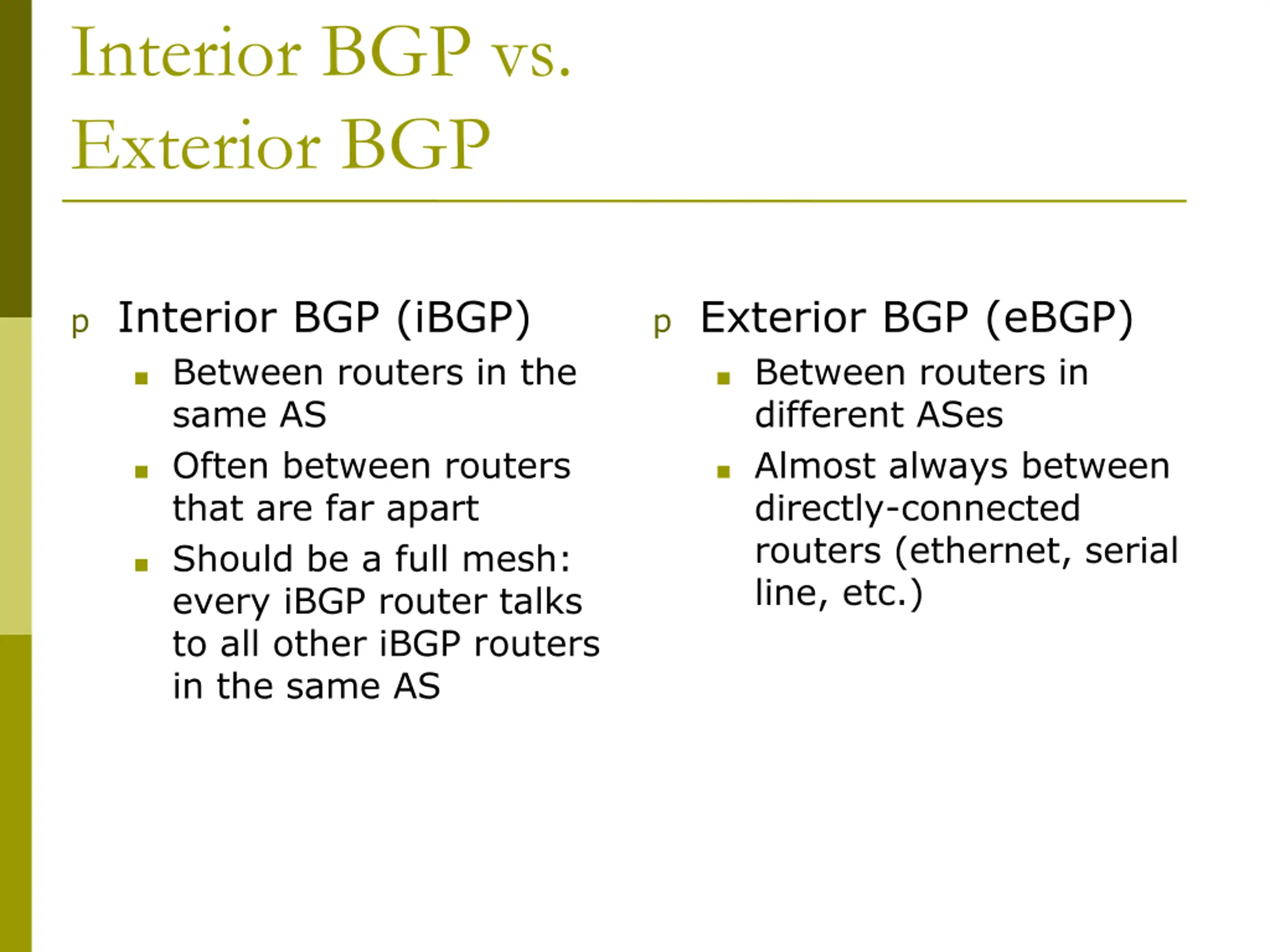 Interior BGP vs. Exterior BGP p Interior BGP (iBGP) Between routers in the same AS Often between routers that are far apart Should be a full mesh: every iBGP router talks to all other iBGP routers in the same AS p Exterior BGP (eBGP) Between routers in different ASes Almost always between directly-connected routers (ethernet, serial line, etc.)
