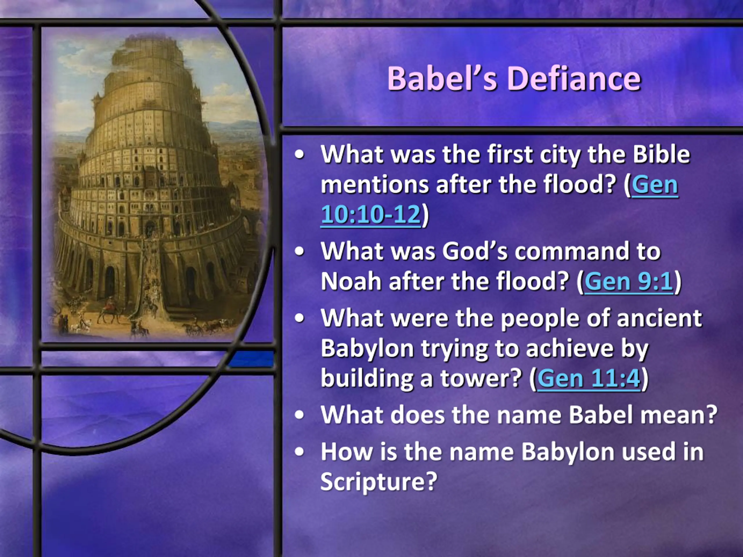 Babels Defiance What was the first city the Bible mentions after the flood? (Gen 10:10-12) What was God s command to Noah after the flood? (Gen 9:1) What were the people of ancient Babylon trying to achieve by building a tower? (Gen 11:4) What does the name Babel mean? How is the name Babylon used in Scripture?