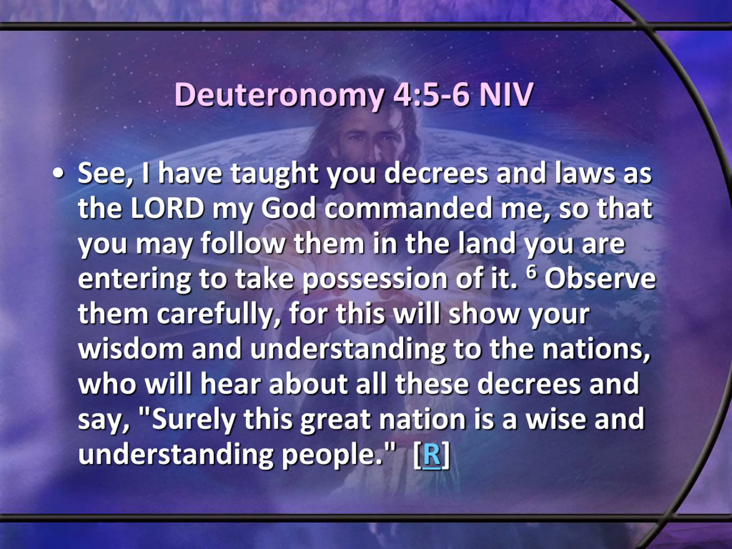 Deuteronomy 4:5-6 NIV See, I have taught you decrees and laws as the LORD my God commanded me, so that you may follow them in the land you are entering to take possession of it. 6Observe them carefully, for this will show your wisdom and understanding to the nations, who will hear about all these decrees and say, "Surely this great nation is a wise and understanding people." [R]