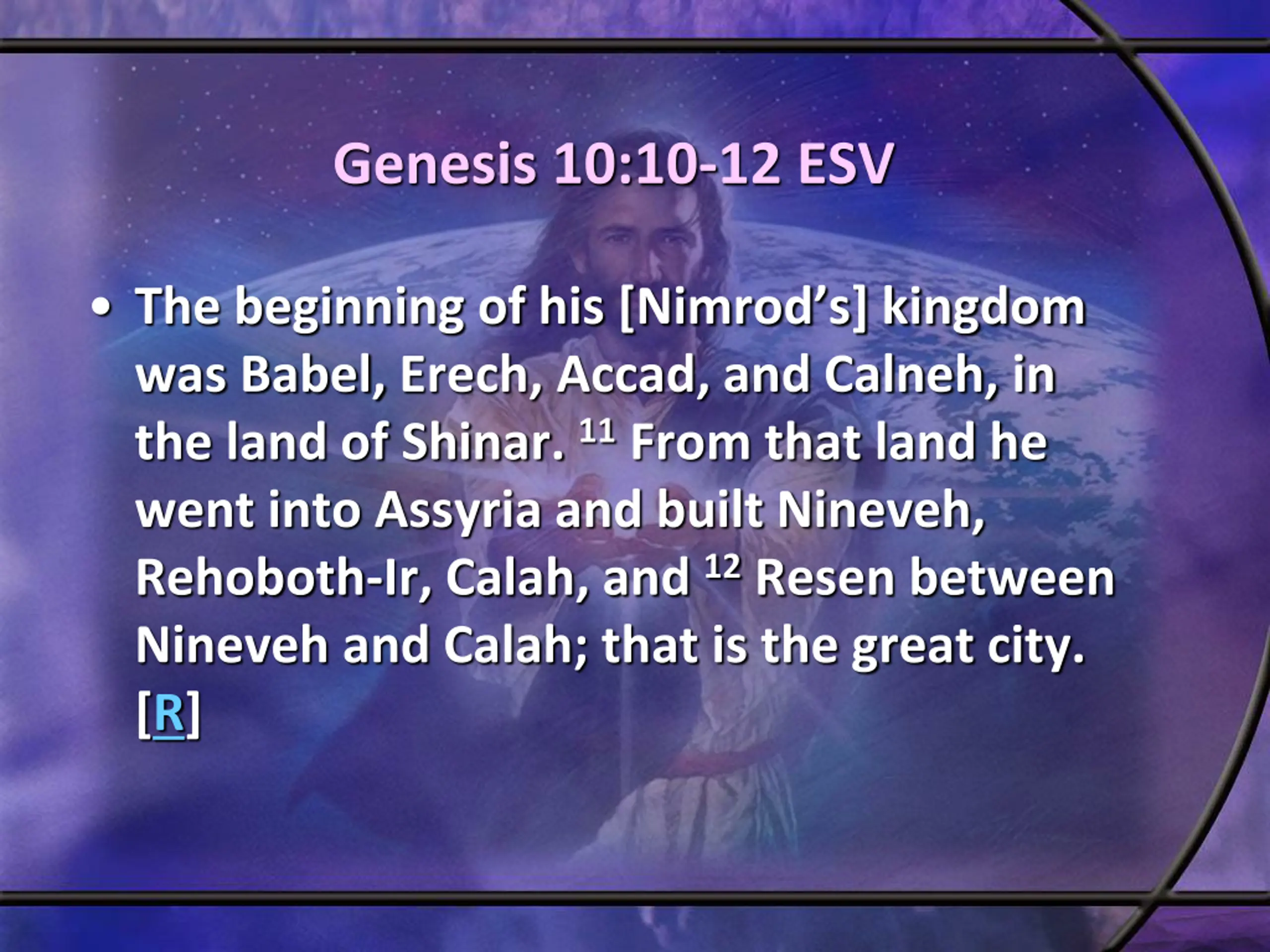 Genesis 10:10-12 ESV The beginning of his [Nimrod s] kingdom was Babel, Erech, Accad, and Calneh, in the land of Shinar. 11From that land he went into Assyria and built Nineveh, Rehoboth-Ir, Calah, and 12Resen between Nineveh and Calah; that is the great city. [R]