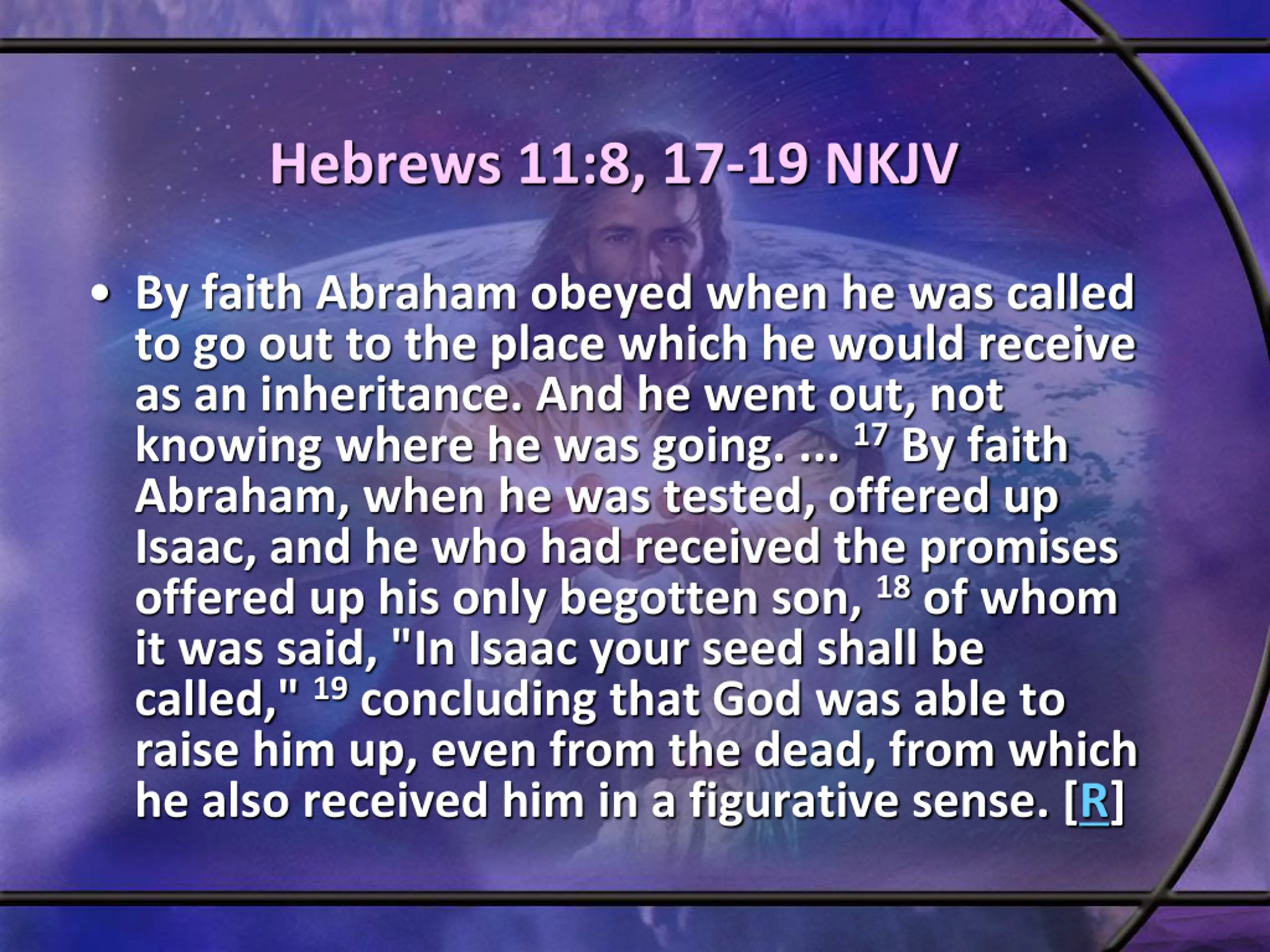 Hebrews 11:8, 17-19 NKJV By faith Abraham obeyed when he was called to go out to the place which he would receive as an inheritance. And he went out, not knowing where he was going. ... 17By faith Abraham, when he was tested, offered up Isaac, and he who had received the promises offered up his only begotten son, 18of whom it was said, "In Isaac your seed shall be called," 19concluding that God was able to raise him up, even from the dead, from which he also received him in a figurative sense. [R]