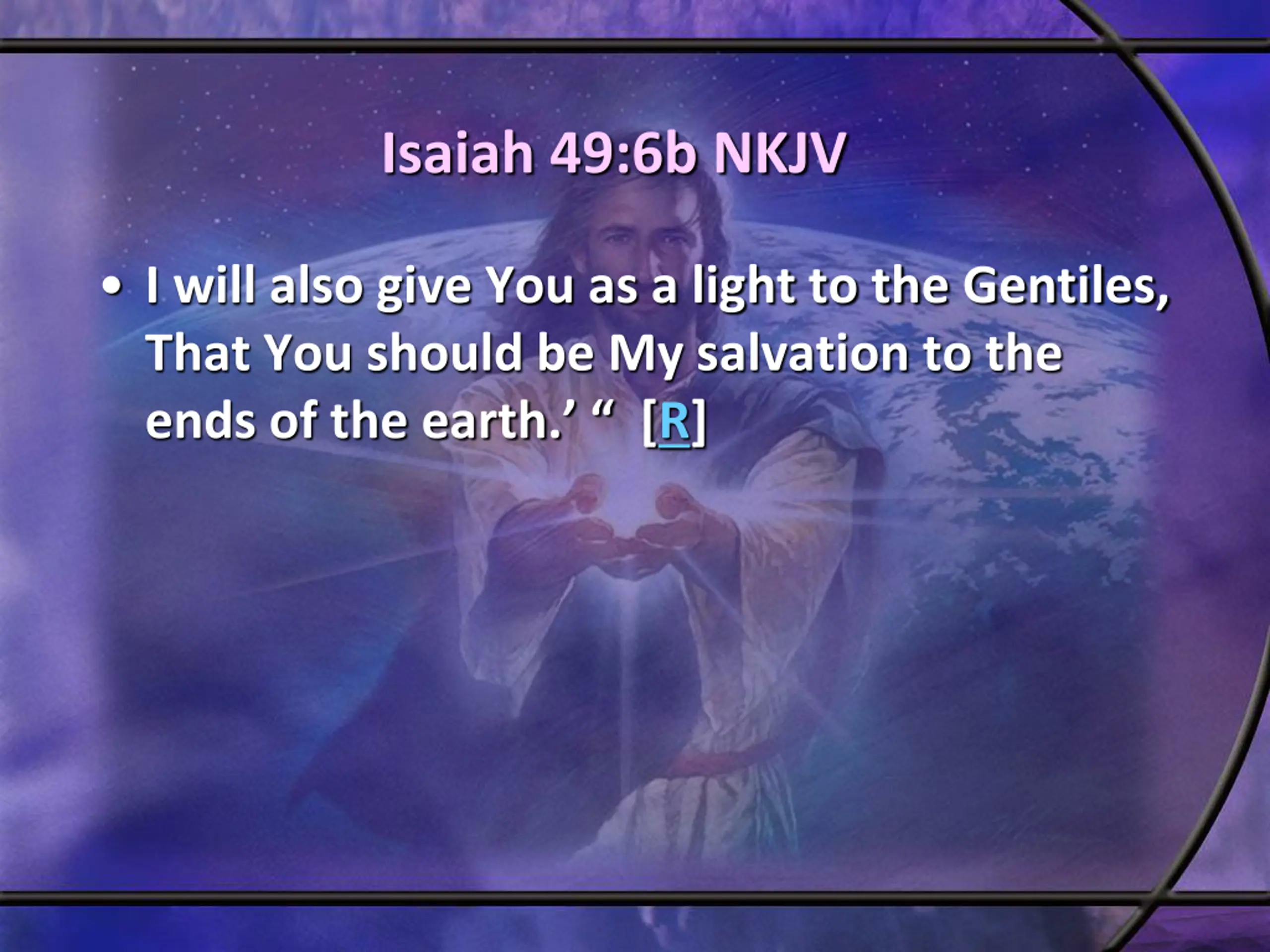 Isaiah 49:6b NKJV I will also give You as a light to the Gentiles, That You should be My salvation to the ends of the earth. [R]