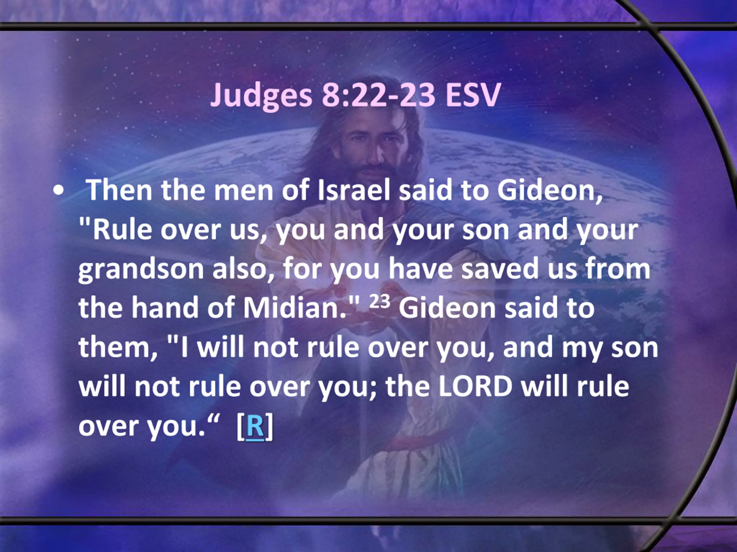 Judges 8:22-23 ESV Then the men of Israel said to Gideon, "Rule over us, you and your son and your grandson also, for you have saved us from the hand of Midian." 23Gideon said to them, "I will not rule over you, and my son will not rule over you; the LORD will rule over you. [R]
