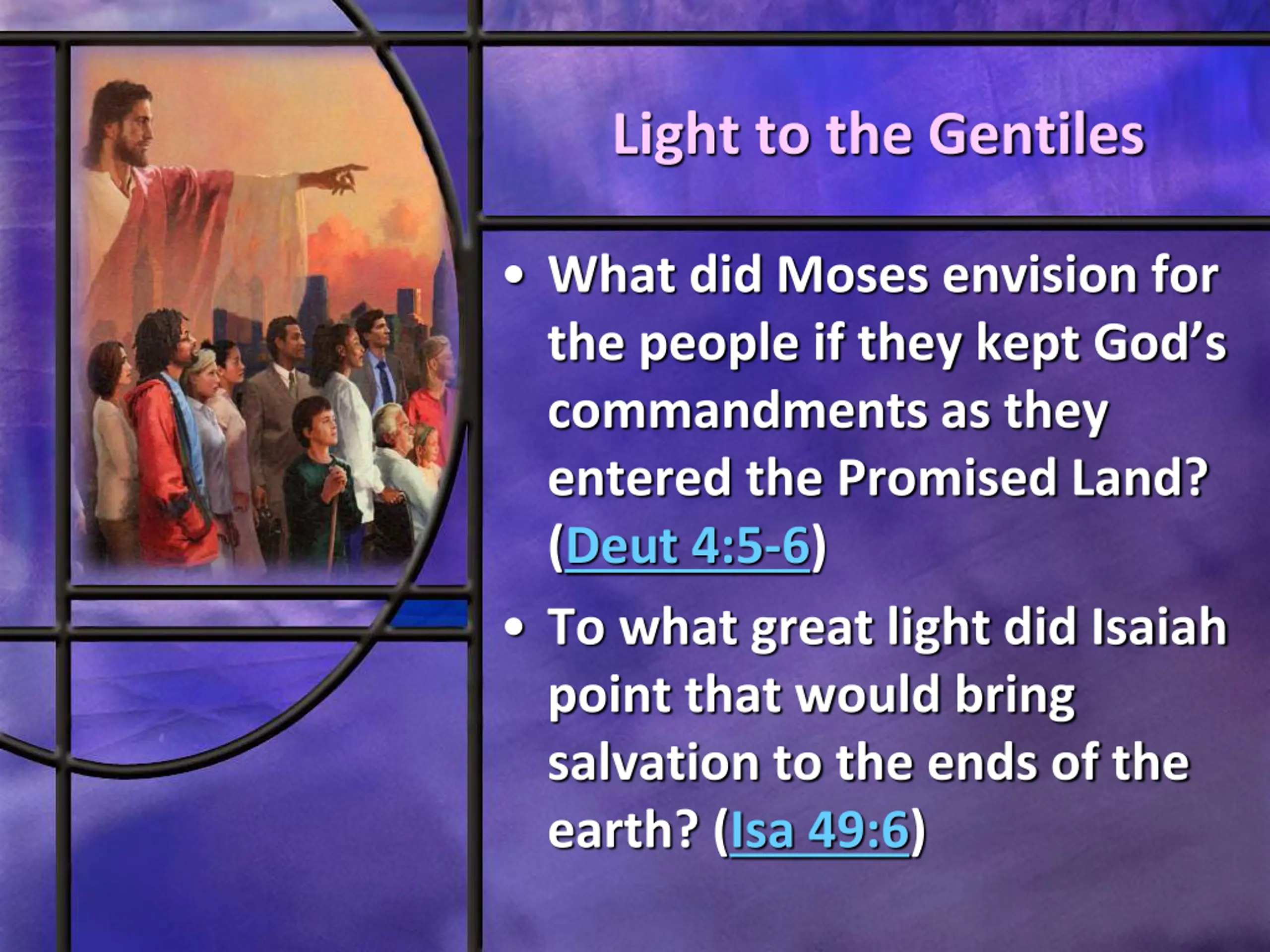 Light to the Gentiles What did Moses envision for the people if they kept God s commandments as they entered the Promised Land? (Deut 4:5-6) To what great light did Isaiah point that would bring salvation to the ends of the earth? (Isa 49:6)