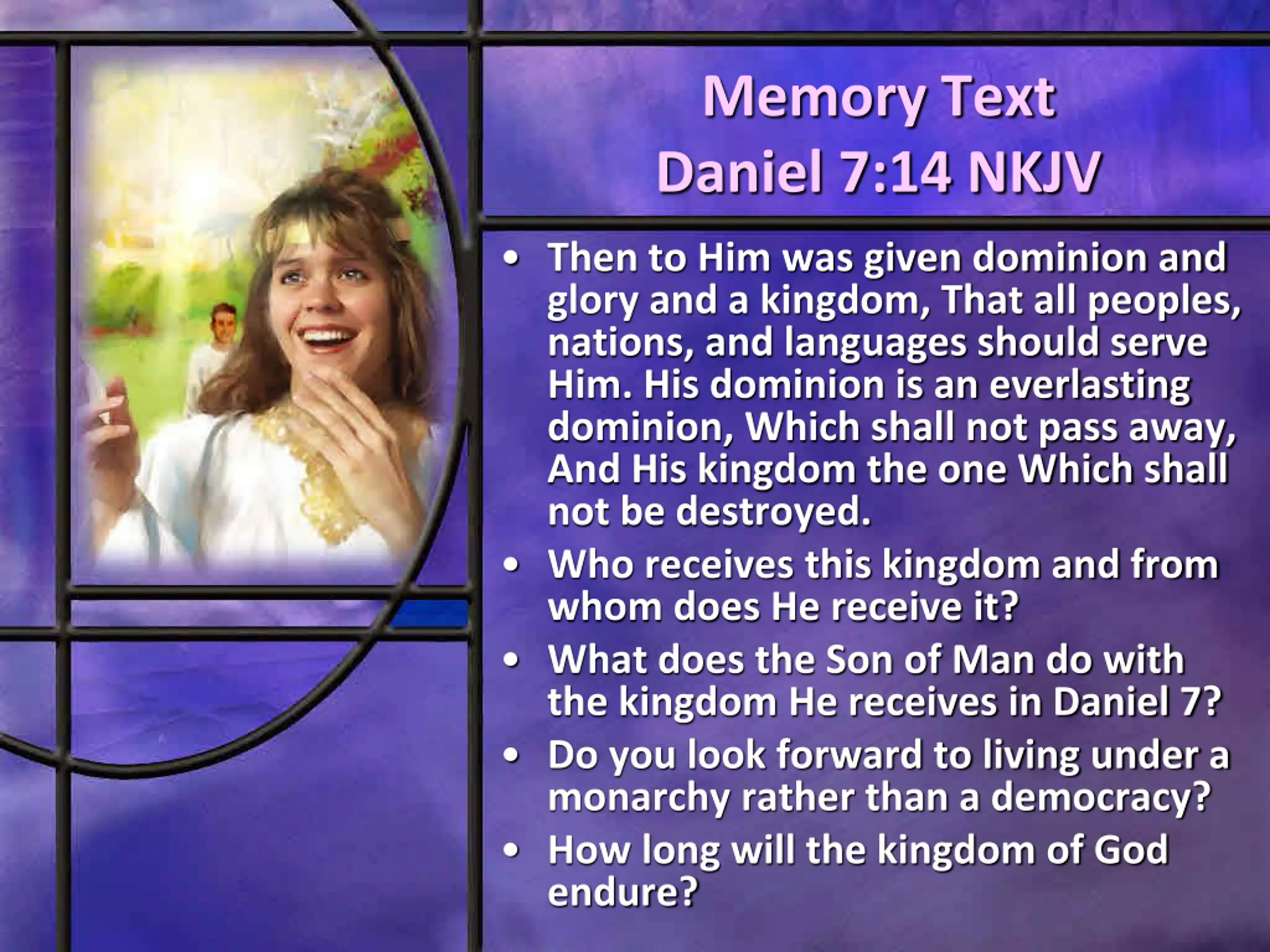 Memory Text Daniel 7:14 NKJV Then to Him was given dominion and glory and a kingdom, That all peoples, nations, and languages should serve Him. His dominion is an everlasting dominion, Which shall not pass away, And His kingdom the one Which shall not be destroyed. Who receives this kingdom and from whom does He receive it? What does the Son of Man do with the kingdom He receives in Daniel 7? Do you look forward to living under a monarchy rather than a democracy? How long will the kingdom of God endure?