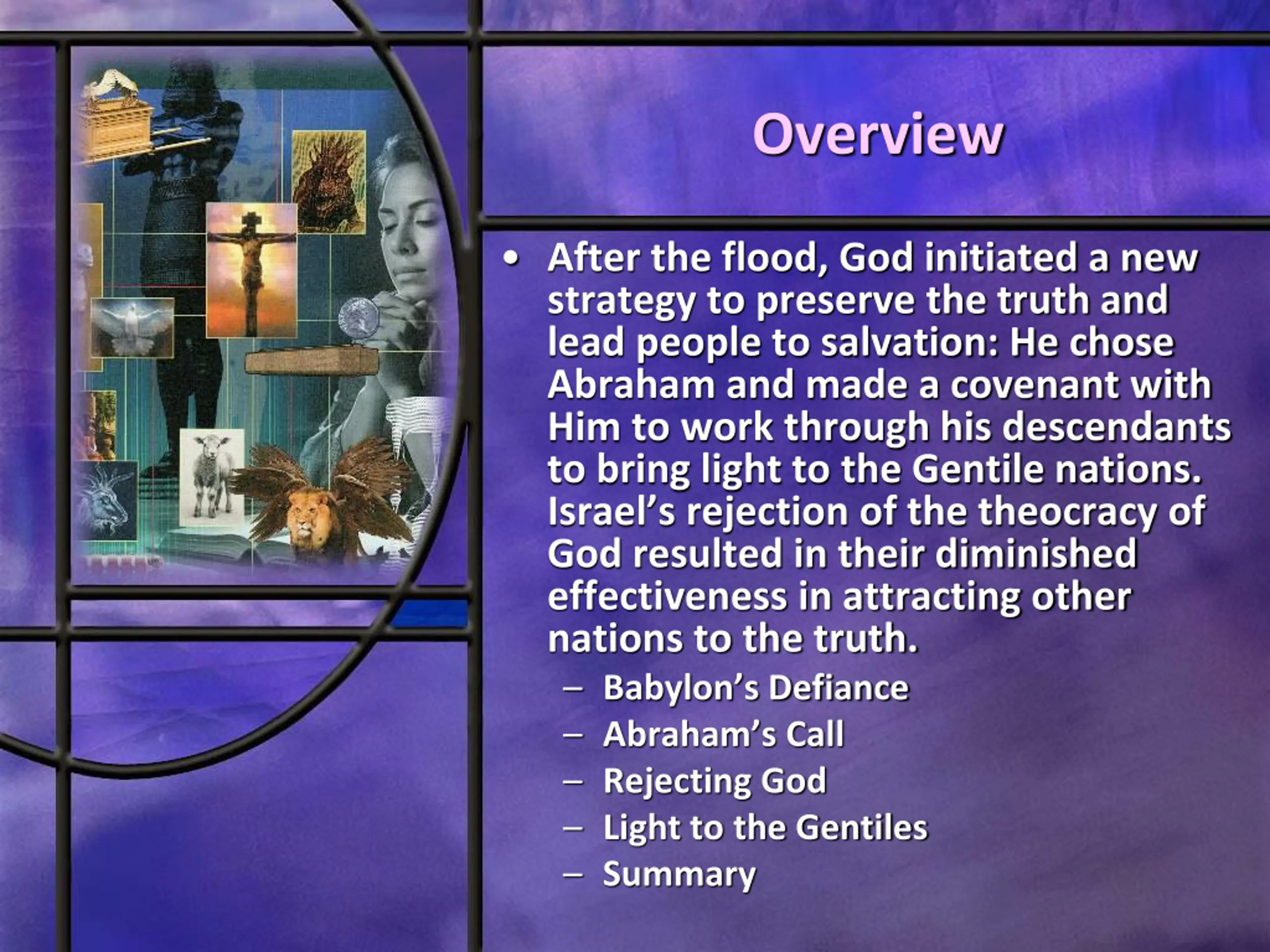 Overview After the flood, God initiated a new strategy to preserve the truth and lead people to salvation: He chose Abraham and made a covenant with Him to work through his descendants to bring light to the Gentile nations. Israel s rejection of the theocracy of God resulted in their diminished effectiveness in attracting other nations to the truth. Babylon s Defiance Abraham s Call Rejecting God Light to the Gentiles Summary
