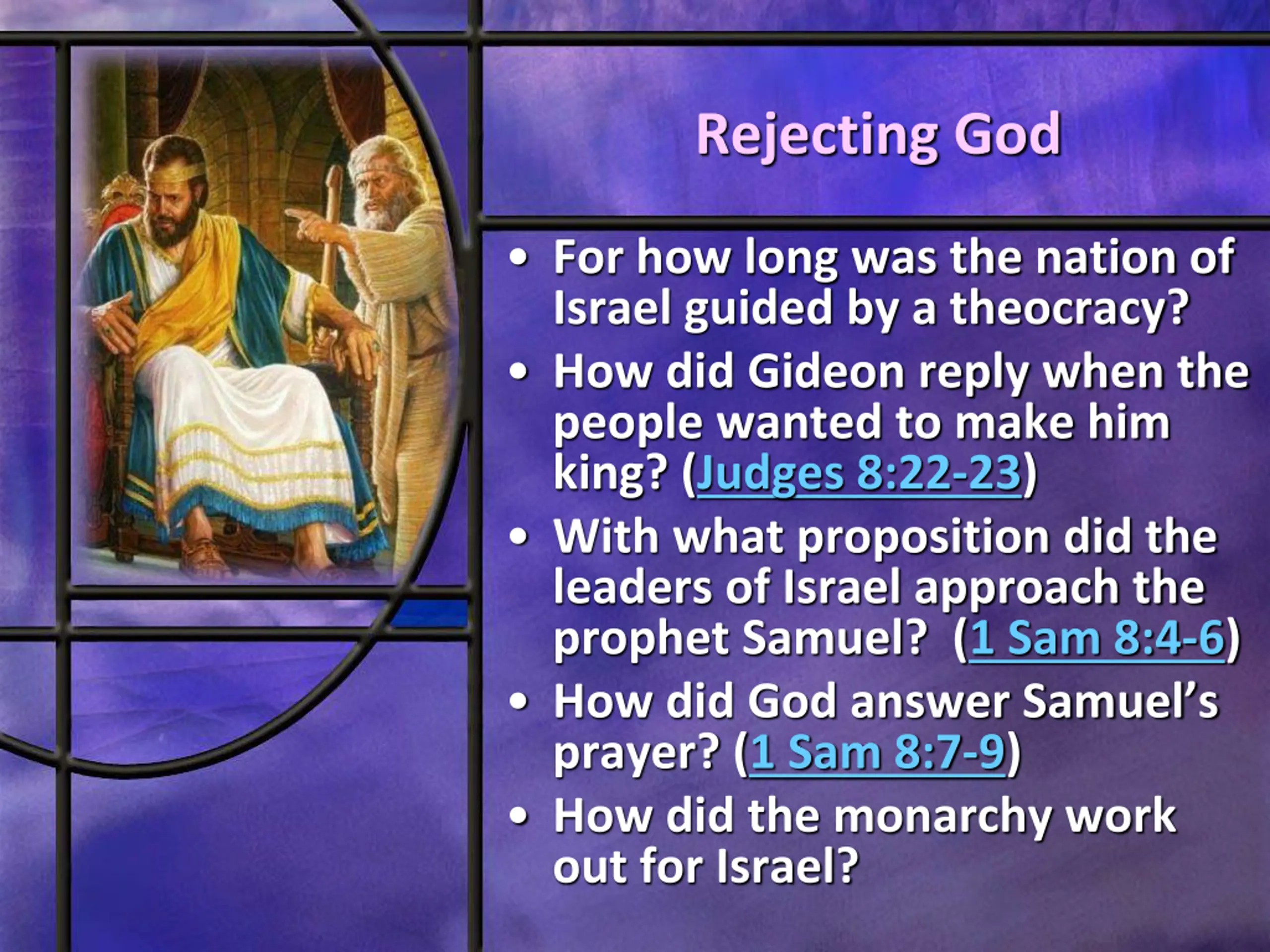 Rejecting God For how long was the nation of Israel guided by a theocracy? How did Gideon reply when the people wanted to make him king? (Judges 8:22-23) With what proposition did the leaders of Israel approach the prophet Samuel? (1 Sam 8:4-6) How did God answer Samuel s prayer? (1 Sam 8:7-9) How did the monarchy work out for Israel?