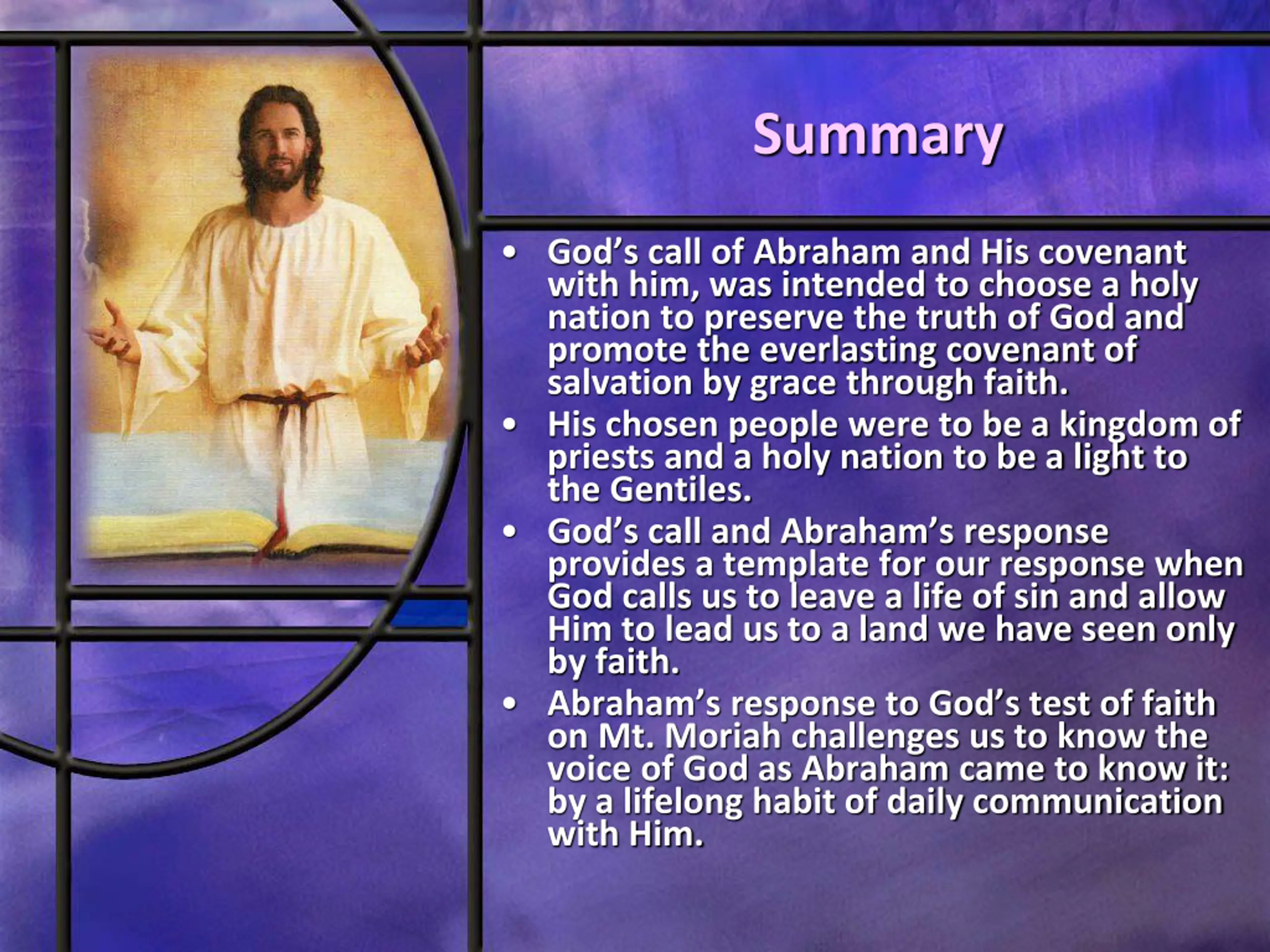 Summary God s call of Abraham and His covenant with him, was intended to choose a holy nation to preserve the truth of God and promote the everlasting covenant of salvation by grace through faith. His chosen people were to be a kingdom of priests and a holy nation to be a light to the Gentiles. God s call and Abraham s response provides a template for our response when God calls us to leave a life of sin and allow Him to lead us to a land we have seen only by faith. Abraham s response to God s test of faith on Mt. Moriah challenges us to know the voice of God as Abraham came to know it: by a lifelong habit of daily communication with Him.