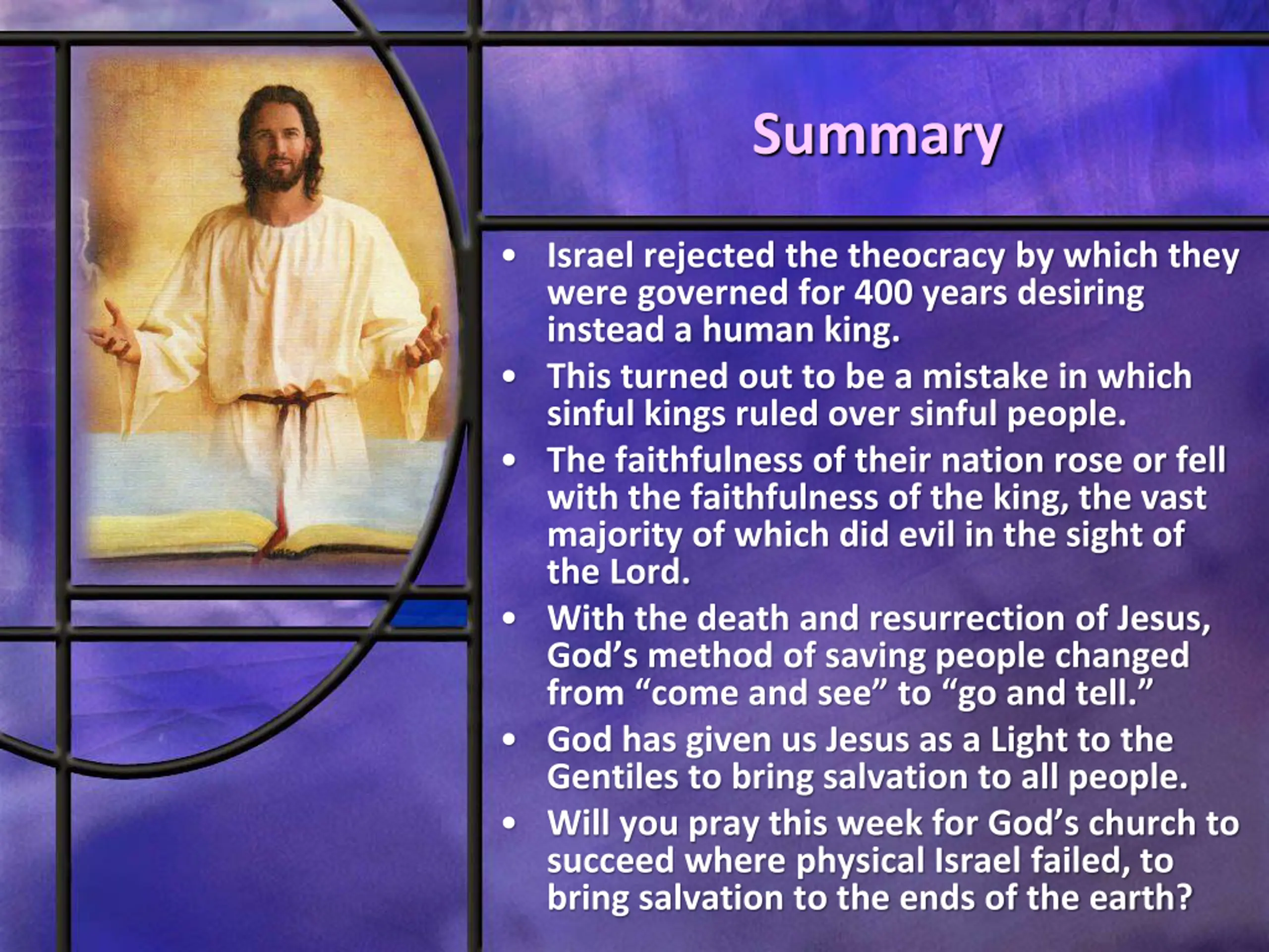 Summary Israel rejected the theocracy by which they were governed for 400 years desiring instead a human king. This turned out to be a mistake in which sinful kings ruled over sinful people. The faithfulness of their nation rose or fell with the faithfulness of the king, the vast majority of which did evil in the sight of the Lord. With the death and resurrection of Jesus, God s method of saving people changed from come and see to go and tell. God has given us Jesus as a Light to the Gentiles to bring salvation to all people. Will you pray this week for God s church to succeed where physical Israel failed, to bring salvation to the ends of the earth?
