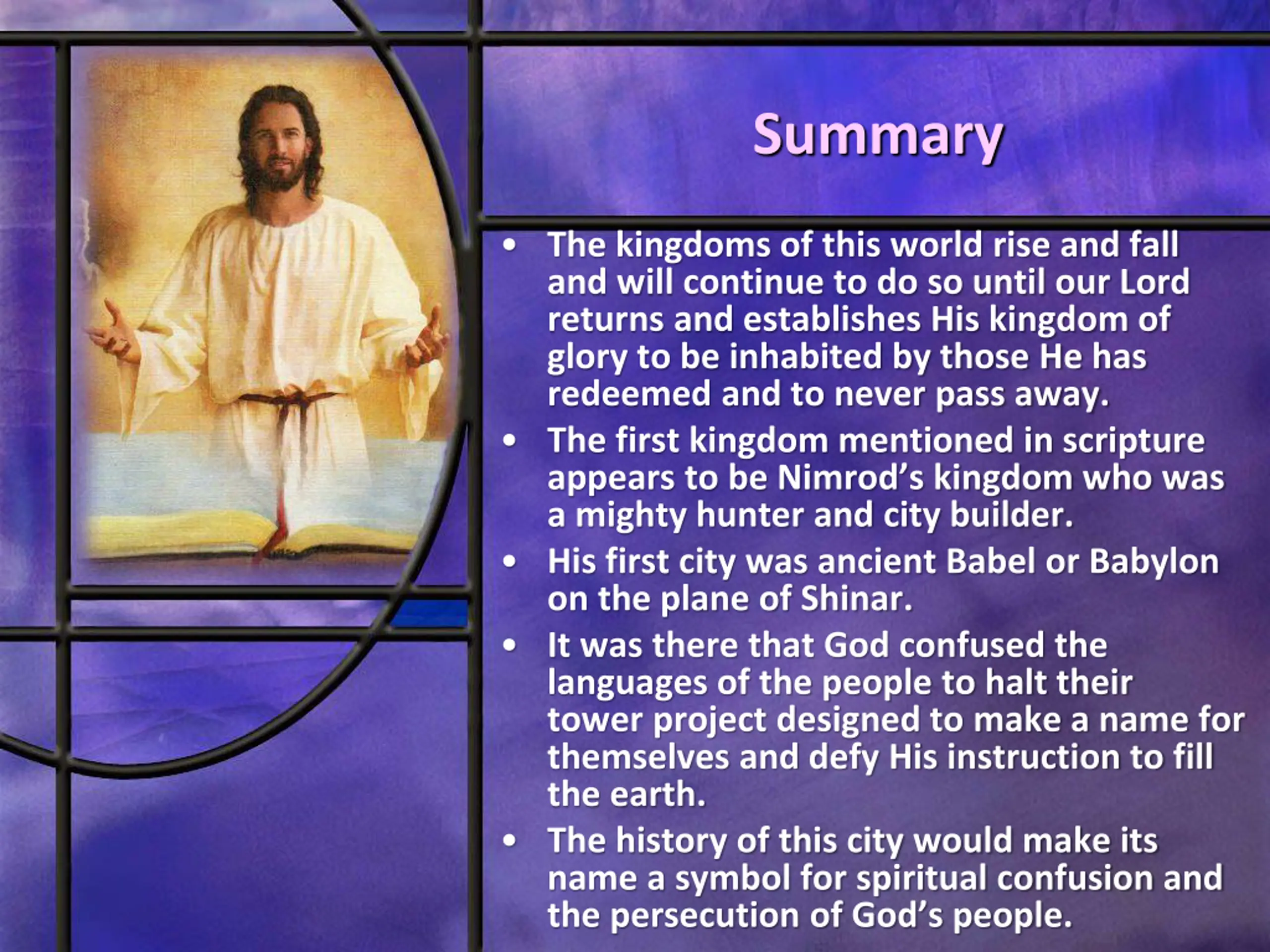 Summary The kingdoms of this world rise and fall and will continue to do so until our Lord returns and establishes His kingdom of glory to be inhabited by those He has redeemed and to never pass away. The first kingdom mentioned in scripture appears to be Nimrod s kingdom who was a mighty hunter and city builder. His first city was ancient Babel or Babylon on the plane of Shinar. It was there that God confused the languages of the people to halt their tower project designed to make a name for themselves and defy His instruction to fill the earth. The history of this city would make its name a symbol for spiritual confusion and the persecution of God s people.