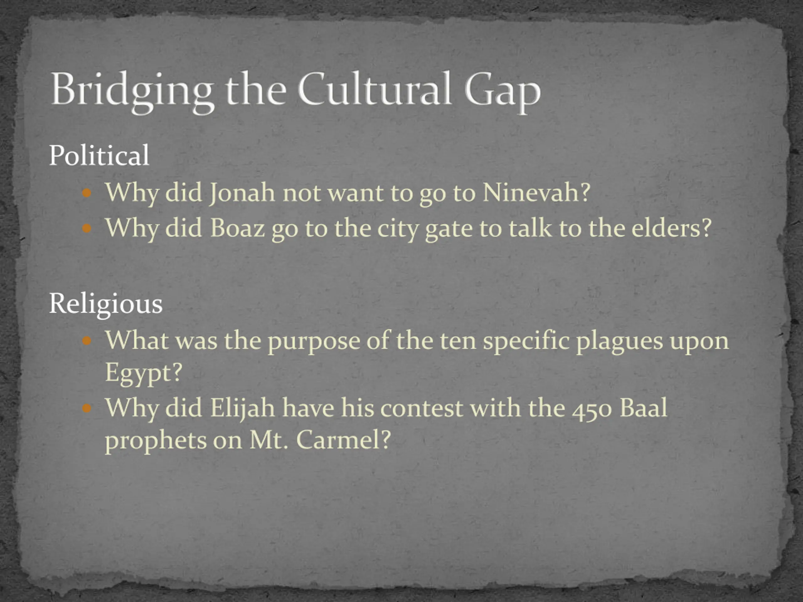 Bridging the Cultural Gap Political Why did Jonah not want to go to Ninevah? Why did Boaz go to the city gate to talk to the elders? Religious What was the purpose of the ten specific plagues upon Egypt? Why did Elijah have his contest with the 450 Baal prophets on Mt. Carmel?