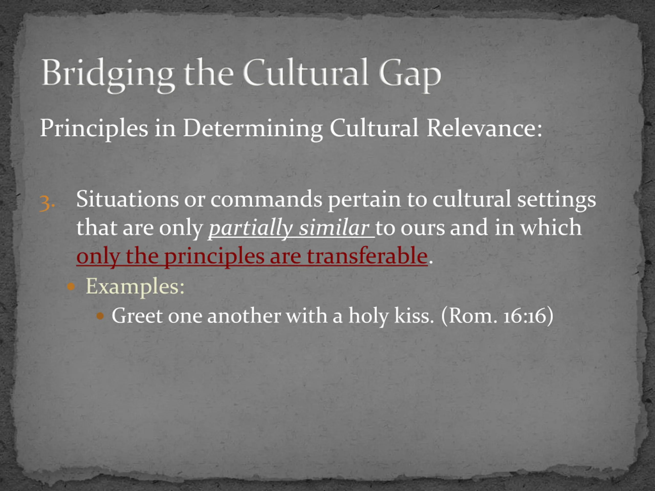 Bridging the Cultural Gap Principles in Determining Cultural Relevance: 3. Situations or commands pertain to cultural settings that are only partially similar to ours and in which only the principles are transferable. Examples: Greet one another with a holy kiss. (Rom. 16:16)