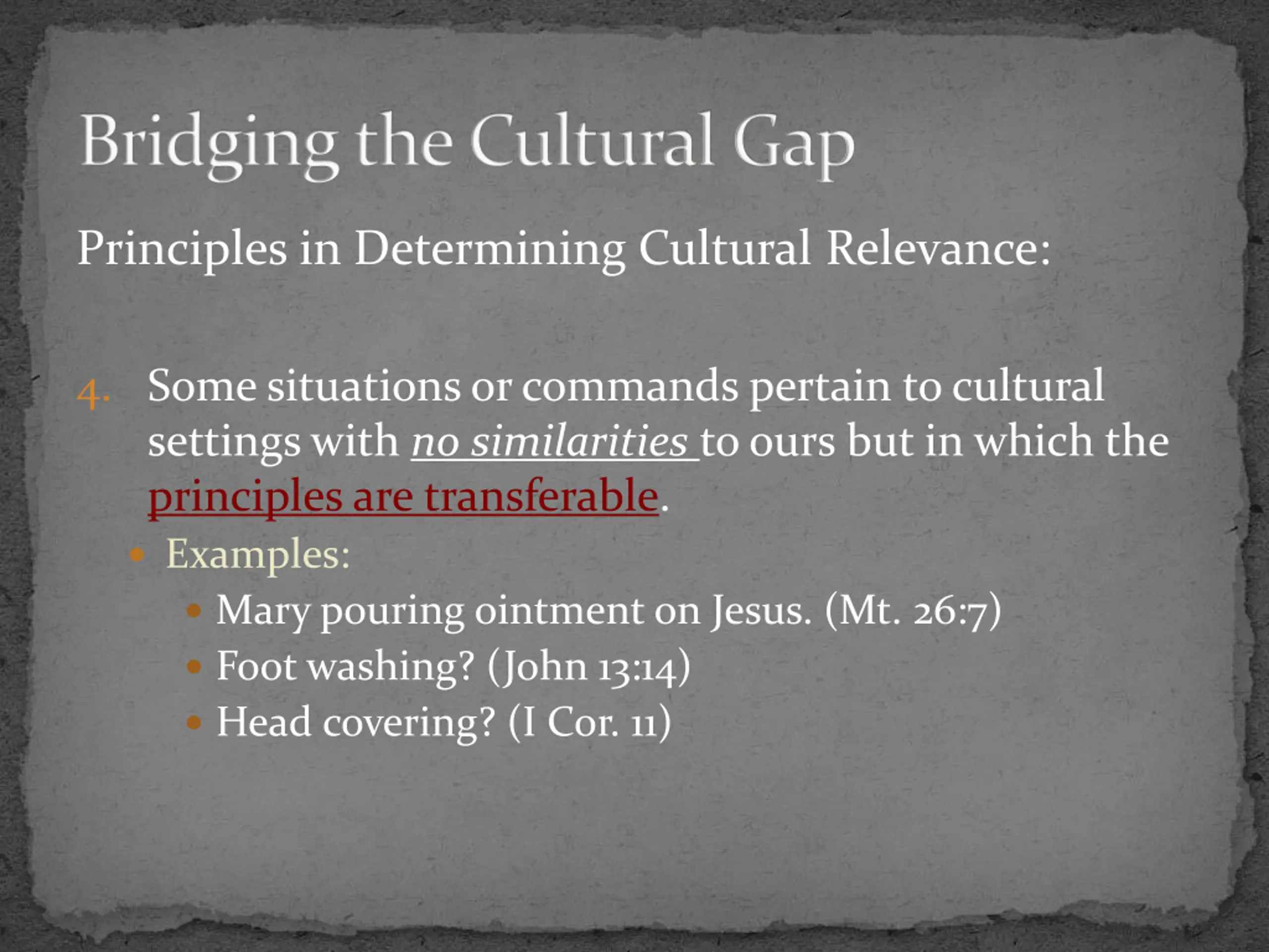 Bridging the Cultural Gap Principles in Determining Cultural Relevance: 4. Some situations or commands pertain to cultural settings with no similarities to ours but in which the principles are transferable. Examples: Mary pouring ointment on Jesus. (Mt. 26:7) Foot washing? (John 13:14) Head covering? (I Cor. 11)
