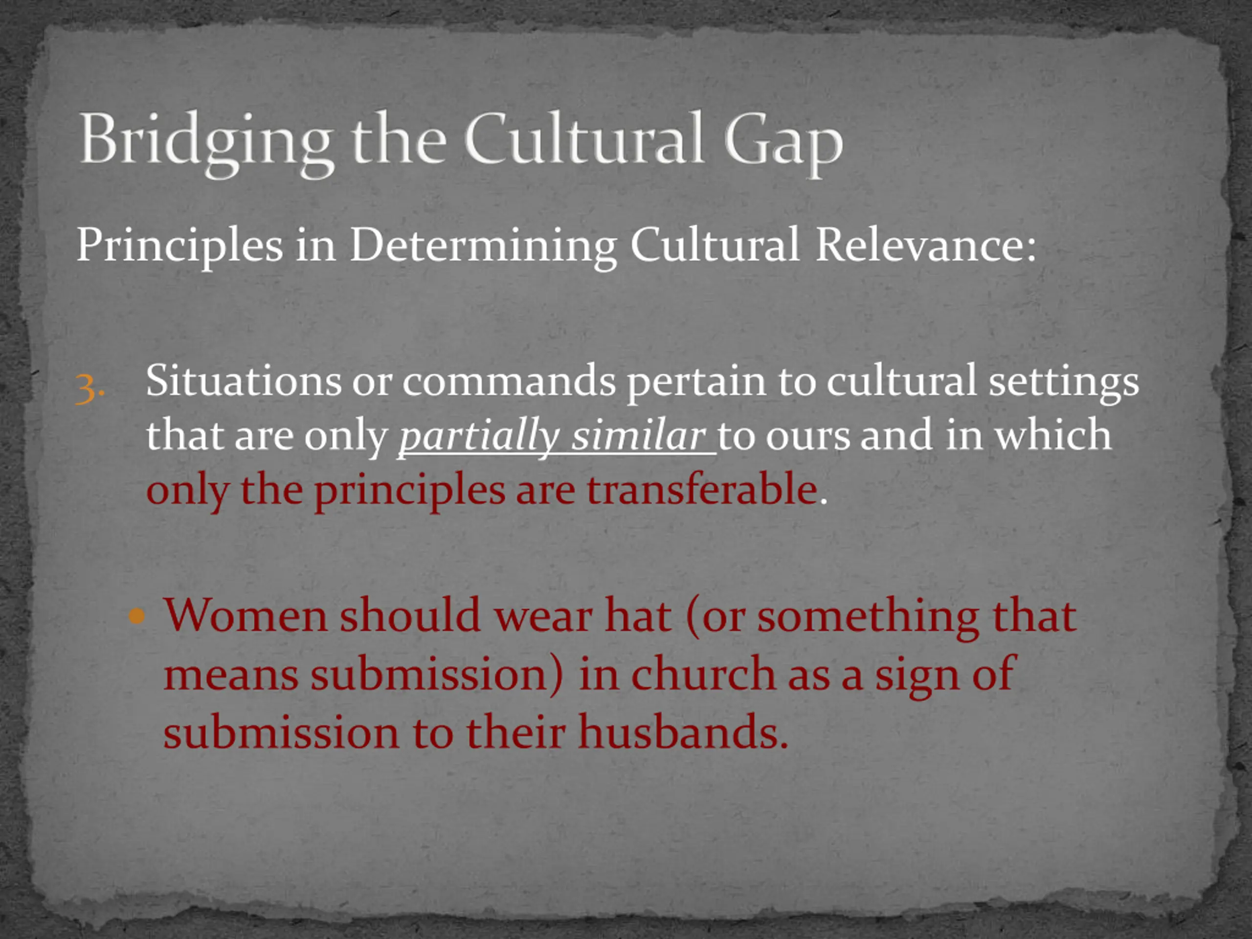 Bridging the Cultural Gap Principles in Determining Cultural Relevance: 3. Situations or commands pertain to cultural settings that are only partially similar to ours and in which only the principles are transferable. Women should wear hat (or something that means submission) in church as a sign of submission to their husbands.