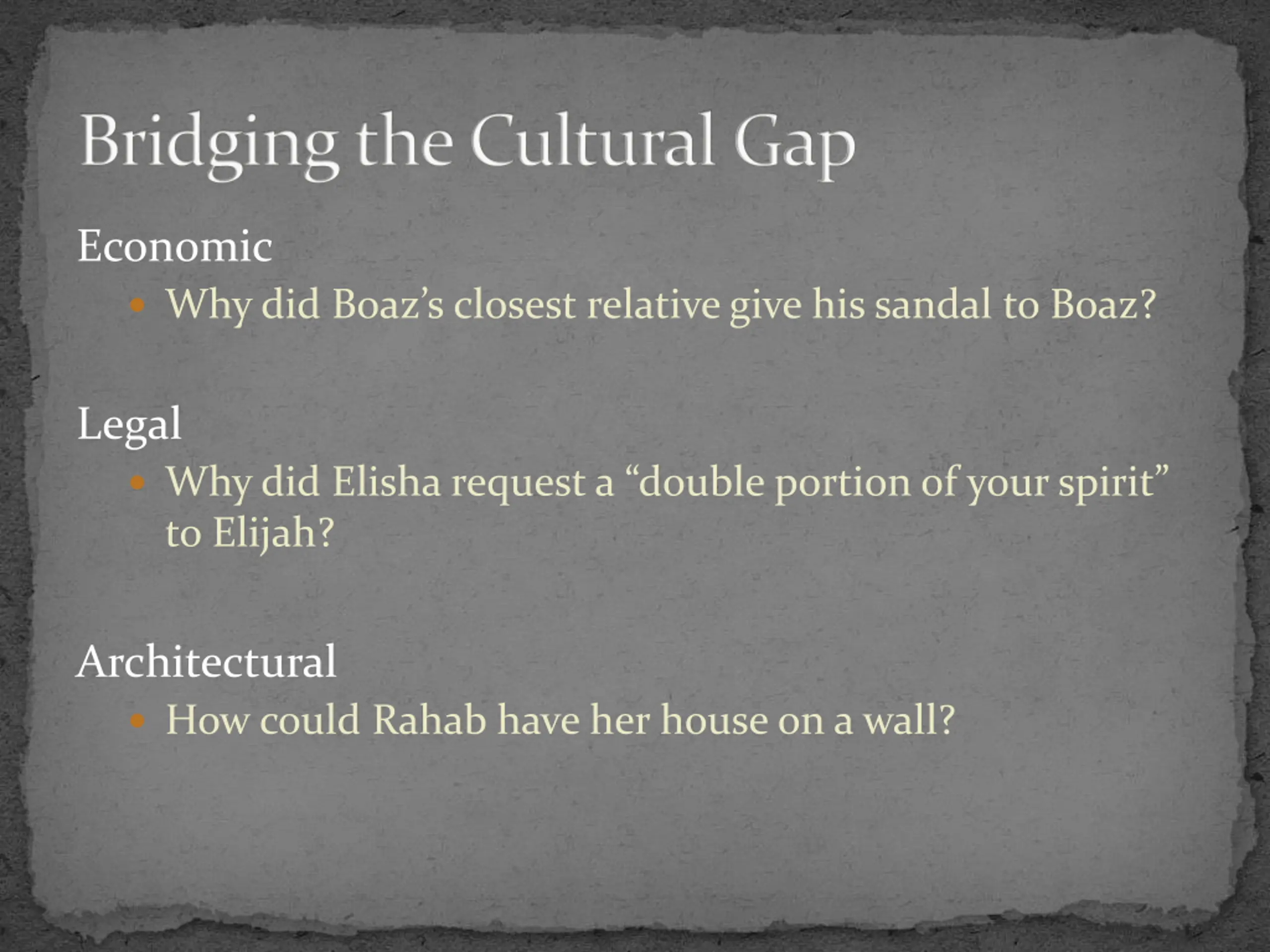 Bridging the Cultural Gap Economic Why did Boaz s closest relative give his sandal to Boaz? Legal Why did Elisha request a double portion of your spirit to Elijah? Architectural How could Rahab have her house on a wall?