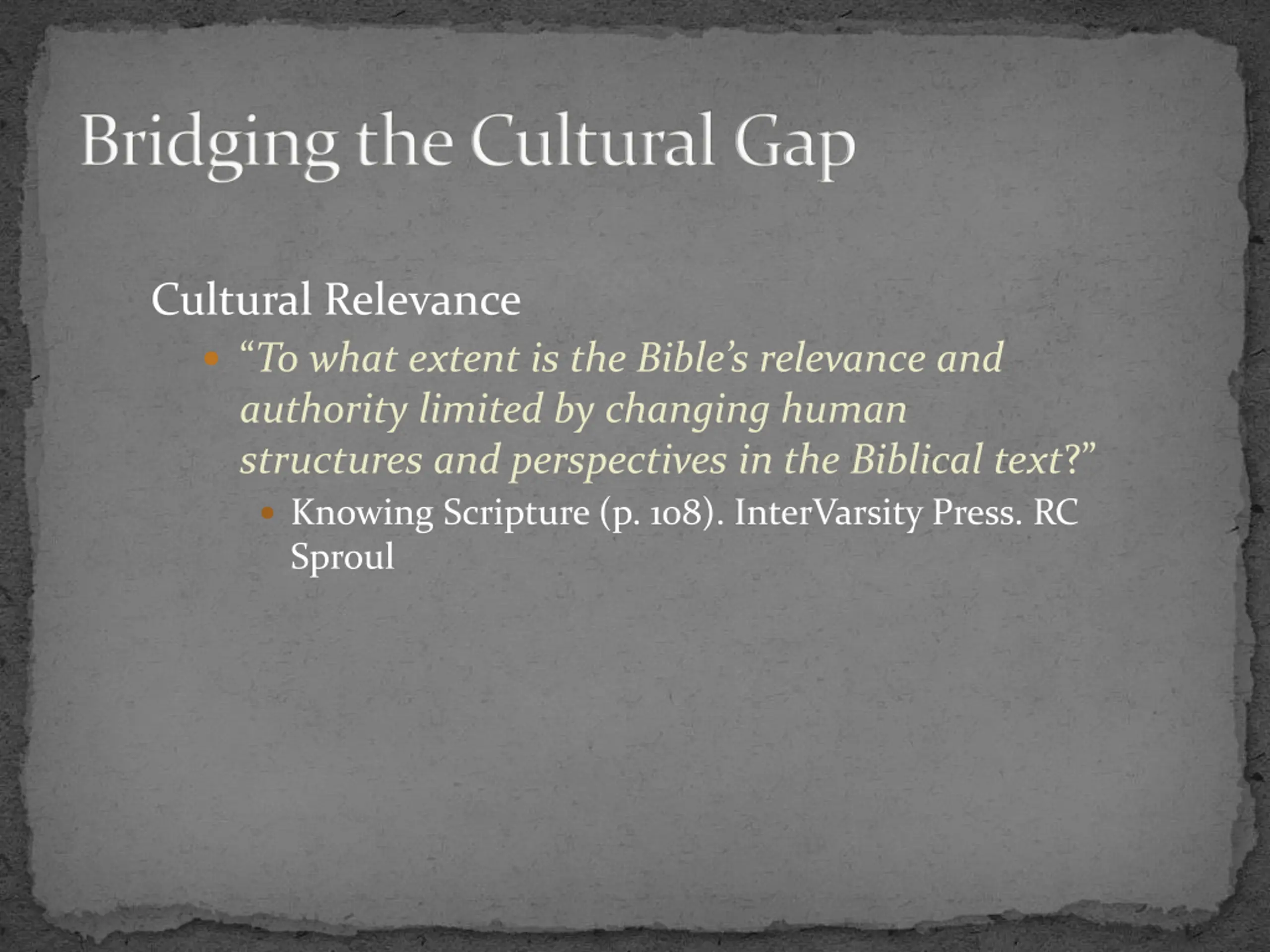 Bridging the Cultural Gap Cultural Relevance To what extent is the Bible s relevance and authority limited by changing human structures and perspectives in the Biblical text? Knowing Scripture (p. 108). InterVarsity Press. RC Sproul