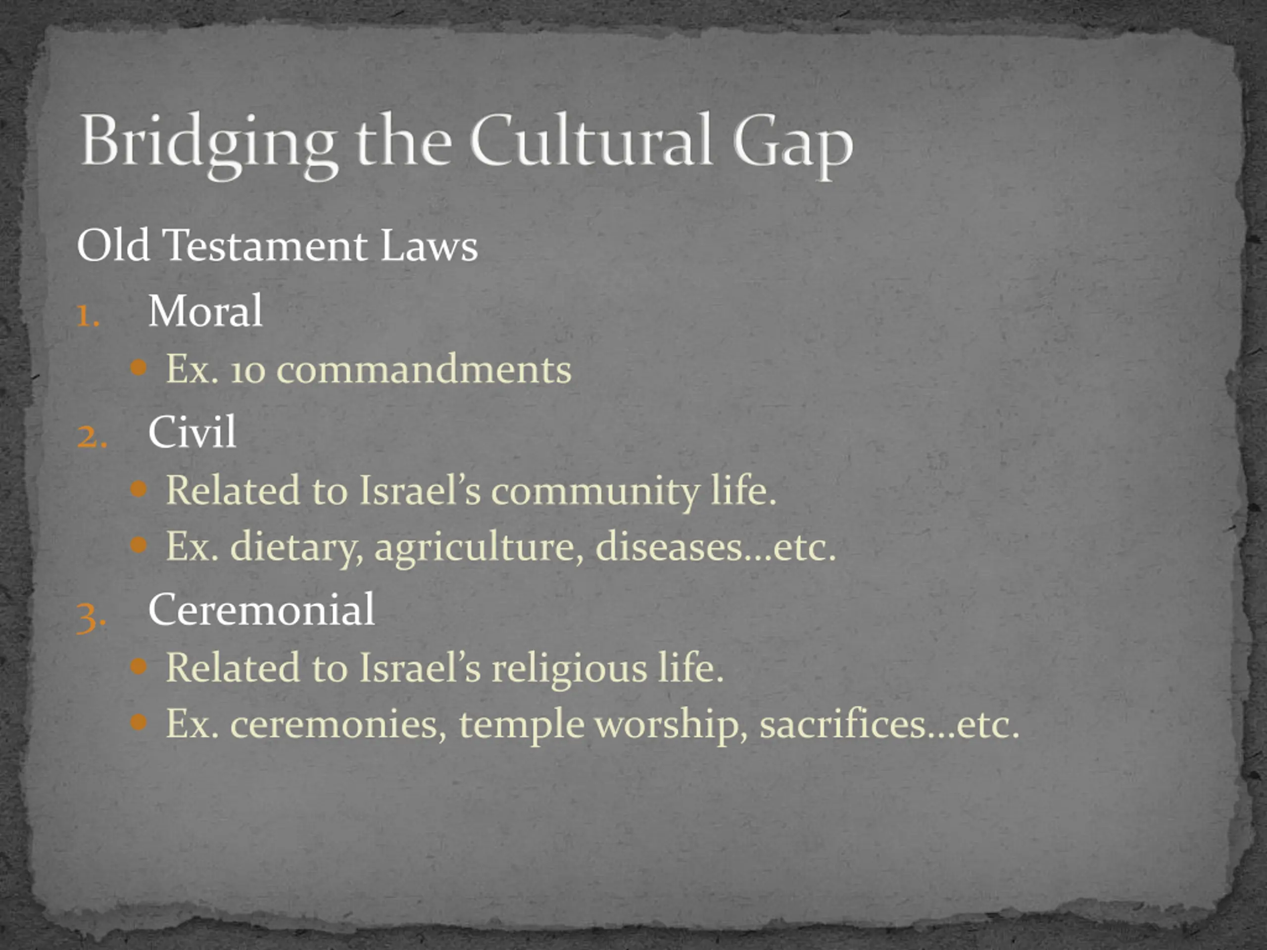 Bridging the Cultural Gap Old Testament Laws 1. Moral Ex. 10 commandments 2. Civil Related to Israel s community life. Ex. dietary, agriculture, diseases etc. 3. Ceremonial Related to Israel s religious life. Ex. ceremonies, temple worship, sacrifices etc.