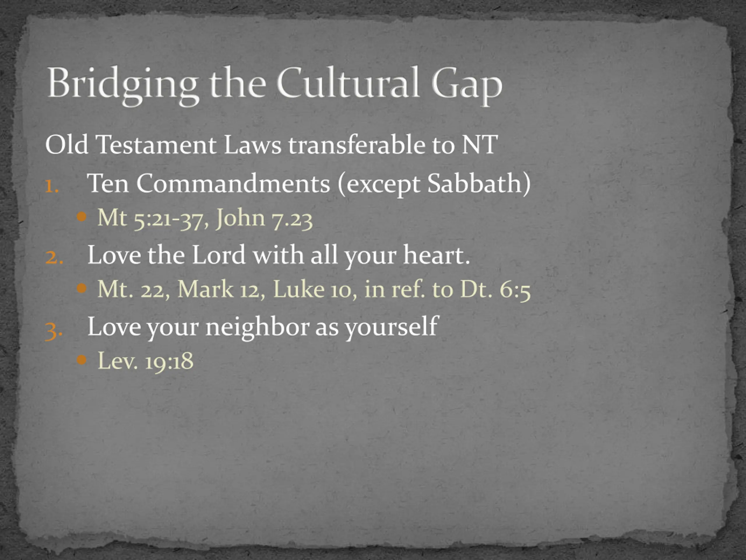 Bridging the Cultural Gap Old Testament Laws transferable to NT 1. Ten Commandments (except Sabbath) Mt 5:21-37, John 7.23 2. Love the Lord with all your heart. Mt. 22, Mark 12, Luke 10, in ref. to Dt. 6:5 3. Love your neighbor as yourself Lev. 19:18