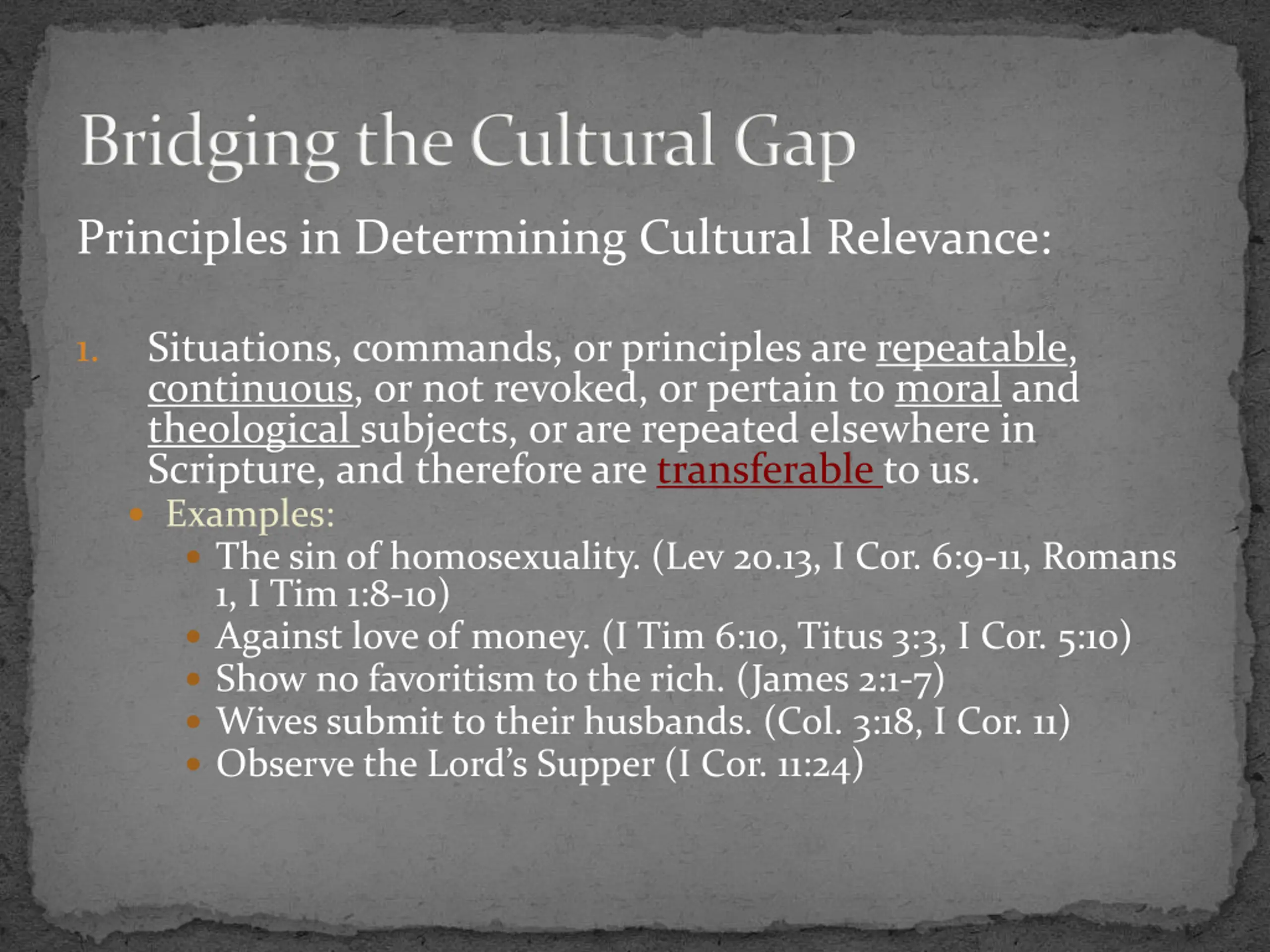Bridging the Cultural Gap Principles in Determining Cultural Relevance: 1. Situations, commands, or principles are repeatable, continuous, or not revoked, or pertain to moral and theological subjects, or are repeated elsewhere in Scripture, and therefore are transferable to us. Examples: The sin of homosexuality. (Lev 20.13, I Cor. 6:9-11, Romans 1, I Tim 1:8-10) Against love of money. (I Tim 6:10, Titus 3:3, I Cor. 5:10) Show no favoritism to the rich. (James 2:1-7) Wives submit to their husbands. (Col. 3:18, I Cor. 11) Observe the Lord s Supper (I Cor. 11:24)