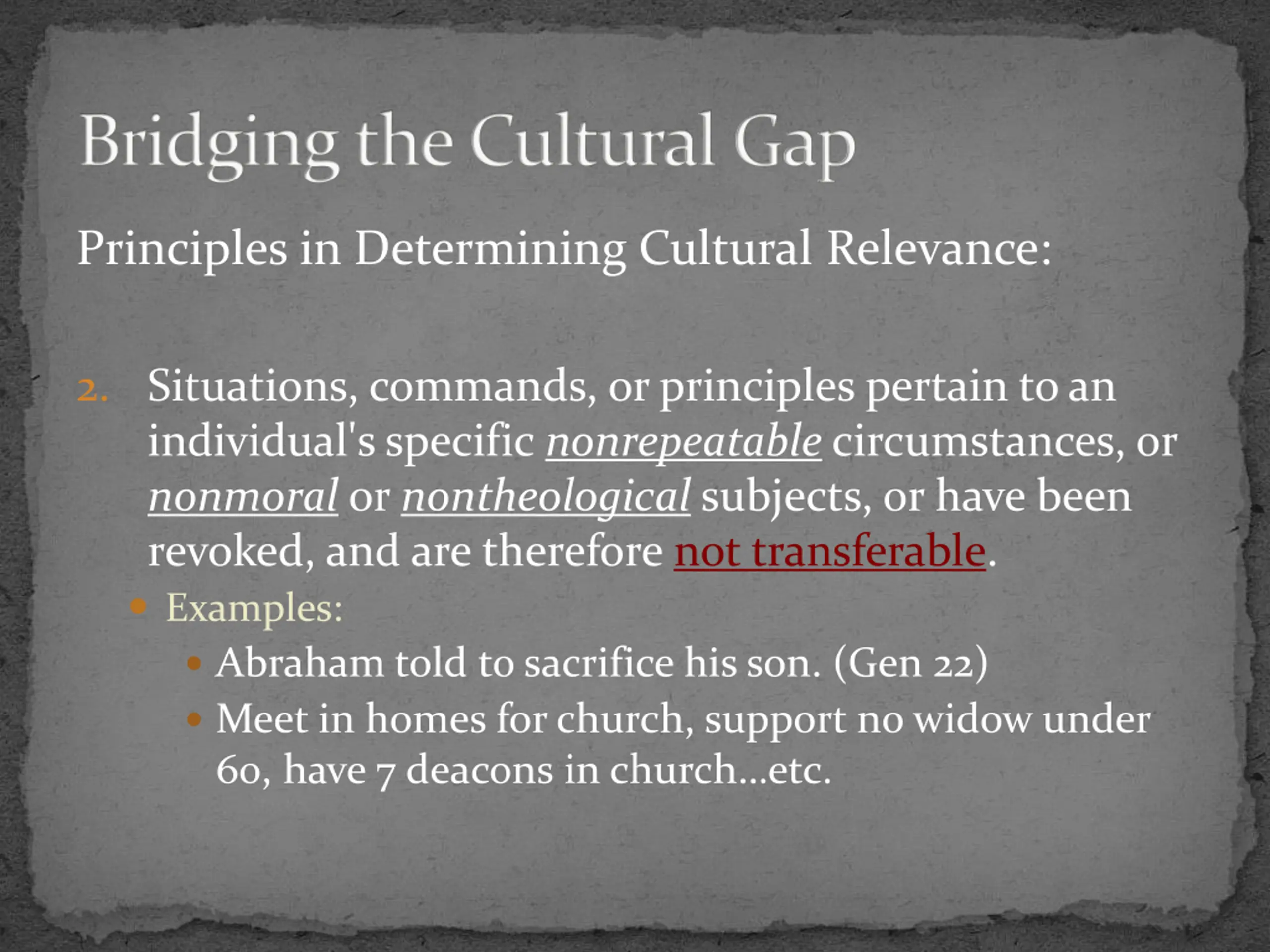 Bridging the Cultural Gap Principles in Determining Cultural Relevance: 2. Situations, commands, or principles pertain to an individual's specific nonrepeatable circumstances, or nonmoral or nontheological subjects, or have been revoked, and are therefore not transferable. Examples: Abraham told to sacrifice his son. (Gen 22) Meet in homes for church, support no widow under 60, have 7 deacons in church etc.