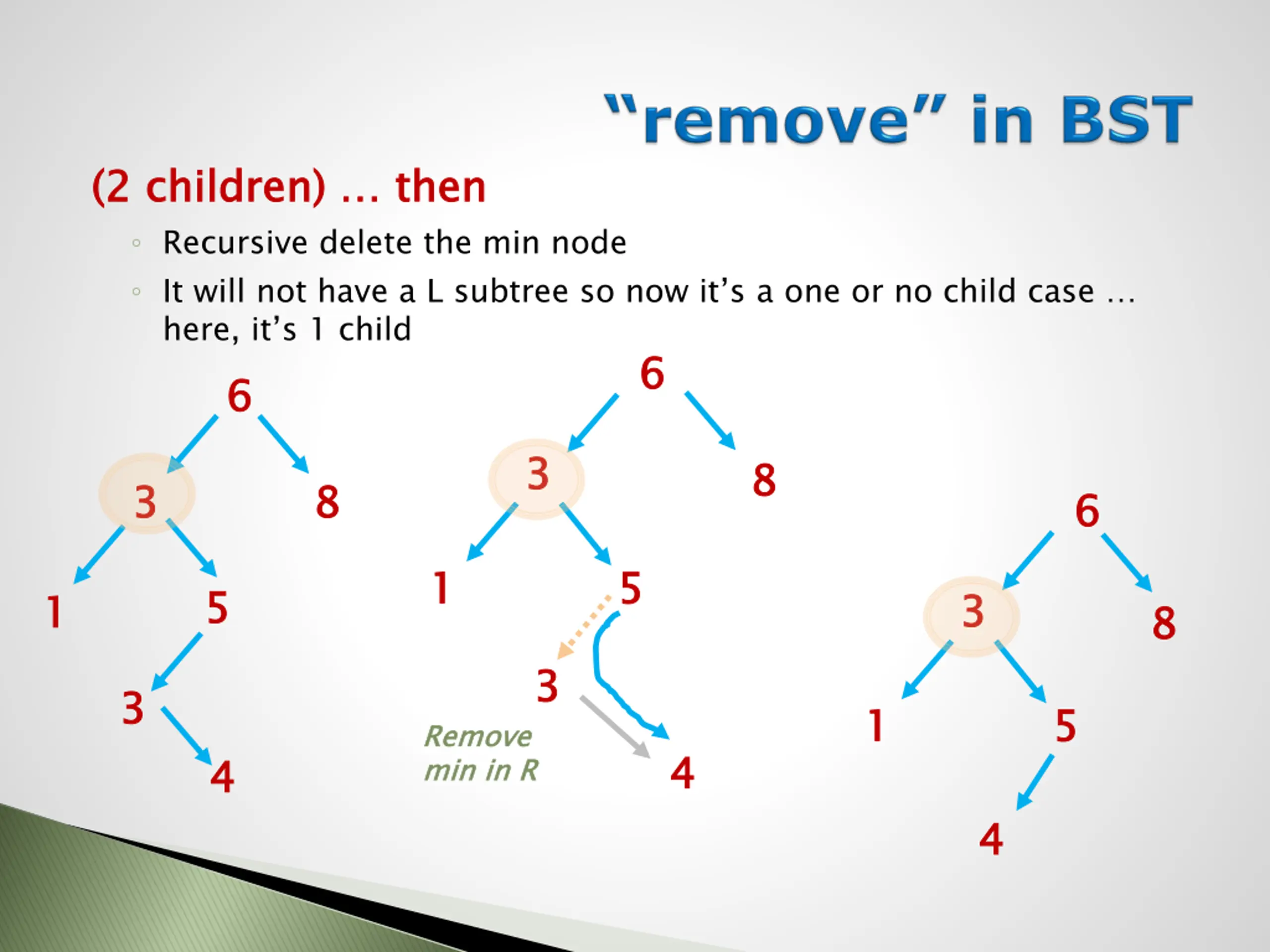 If has 2 children, findMin in R subtree Replace node val being deleted with this min val If has 2 children, then then 6 6 6 6 3 3 8 8 2 2 8 8 5 5 5 5 1 1 1 1 3 3 3 3 remove(2) remove(2) copy value copy value 4 4 4 4