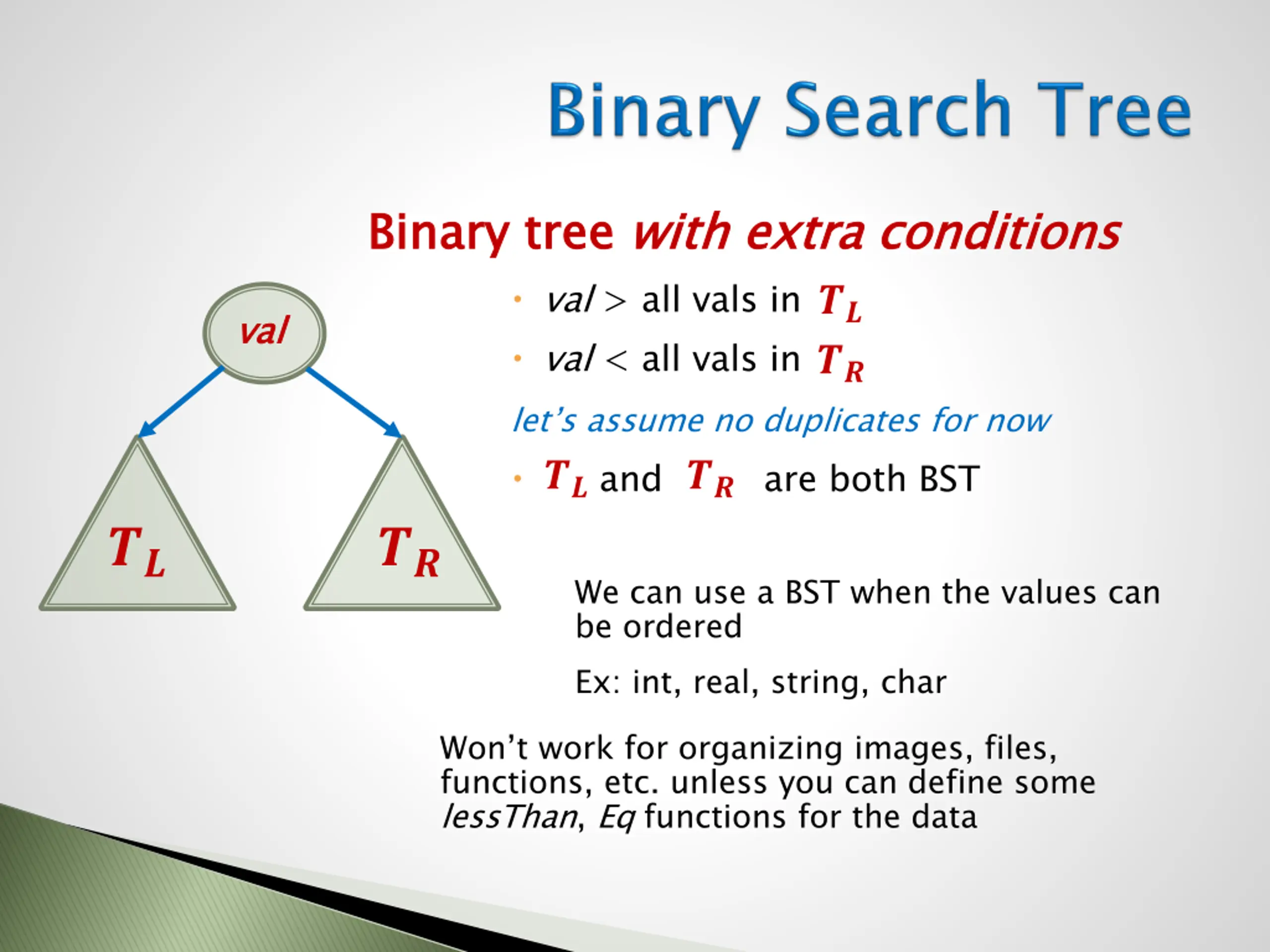 Binary tree Binary tree with extra conditions val > all vals in val < all vals in let s assume no duplicates for now and are both BST ?? with extra conditions ?? ?? val val ?? ?? ?? We can use a BST when the values can be ordered Ex: int, real, string, char Won t work for organizing images, files, functions, etc. unless you can define some lessThan, Eq functions for the data