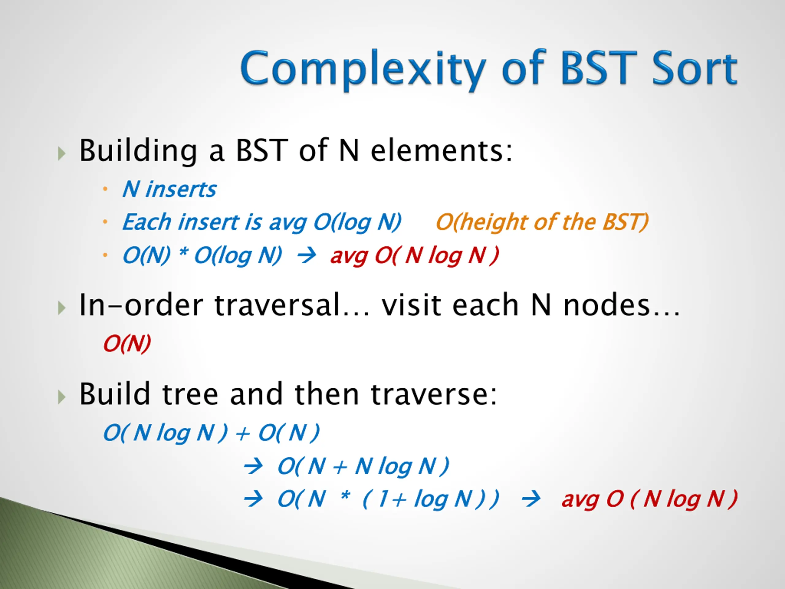 Building a BST of N elements: N inserts Each insert is O(N) * O(log N) In-order traversal visit each N nodes O(N) Build tree and then traverse: O( N log N ) + O( N ) N inserts Each insert is avg O(N) * O(log N) avg O(log N) avg O(log N) O(height of the BST) avg O( N log N ) O(height of the BST) O( N log N ) O(N) O( N log N ) + O( N ) O( N + N log N ) O( N * ( 1+ log N ) ) O( N + N log N ) O( N * ( 1+ log N ) ) avg avg O ( N log N ) O ( N log N )