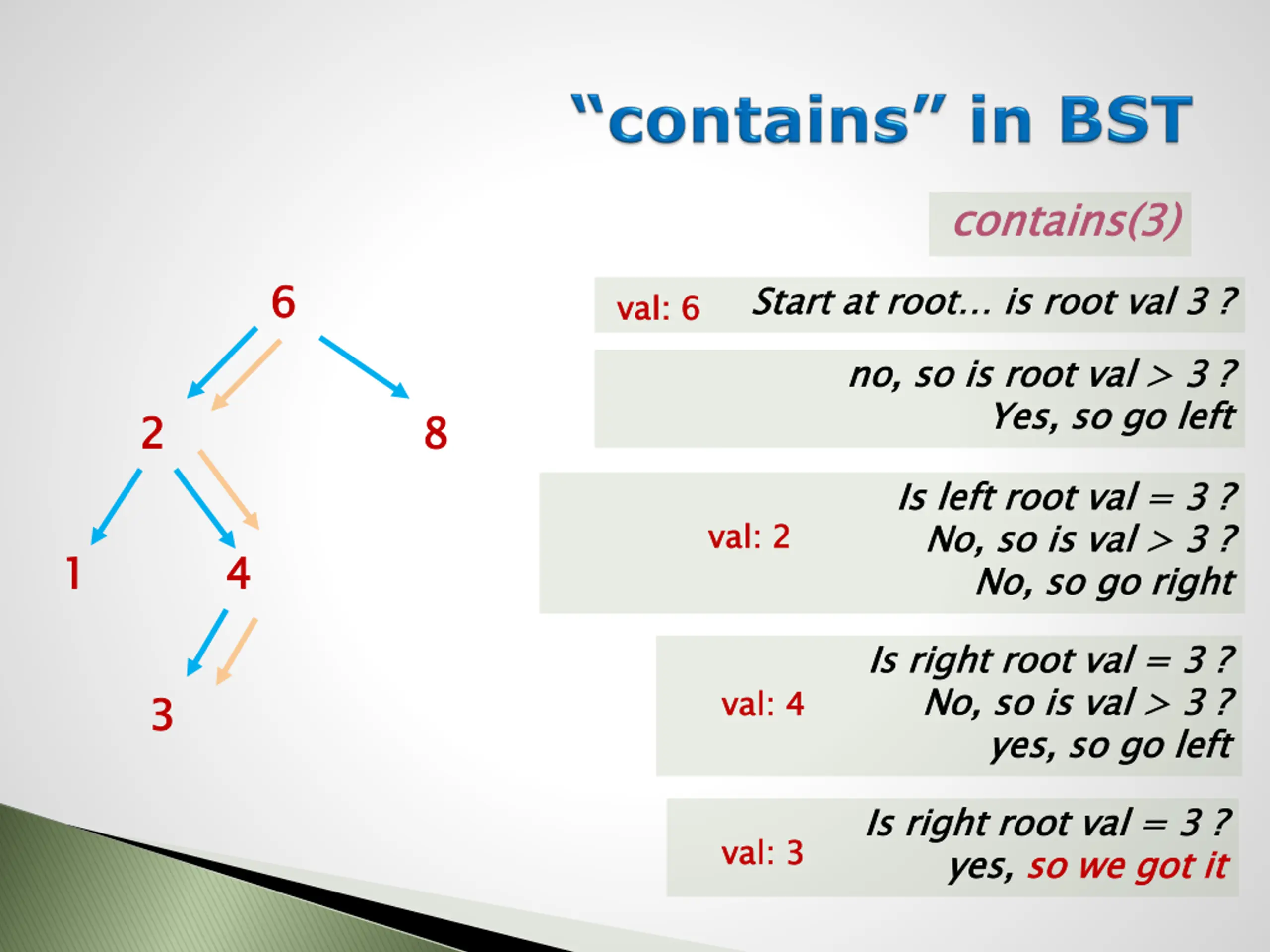 c contains(3) ontains(3) 6 6 Start at root is root val Start at root is root val 3 ? 3 ? v val al: 6 : 6 no, so is root no, so is root val Yes, so go left val > 3 ? > 3 ? Yes, so go left 2 2 8 8 Is left root val No, so is val No, so go right Is left root No, so is No, so go right val = 3 ? val > 3 ? = 3 ? > 3 ? v val al: 2 : 2 1 1 4 4 Is right root No, so is Is right root val No, so is val yes, so go left val = 3 ? val > 3 ? = 3 ? > 3 ? v val al: 4 : 4 3 3 yes, so go left Is right root yes, Is right root val yes, so we got it val = 3 ? so we got it = 3 ? v val al: 3 : 3