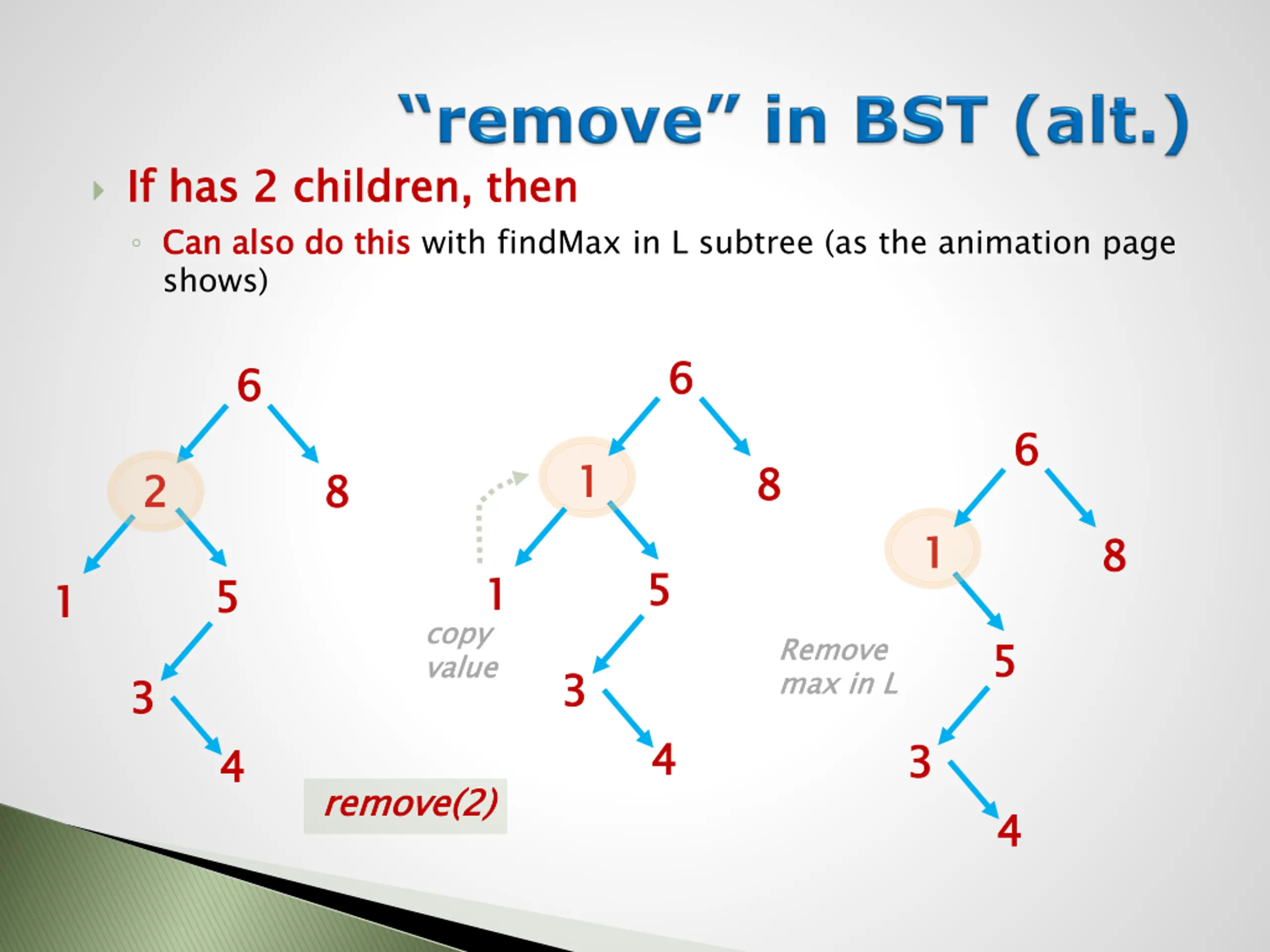 If has 2 children, then Can also do this shows) If has 2 children, then Can also do this with findMax in L subtree (as the animation page 6 6 6 6 6 6 1 1 8 8 2 2 8 8 1 1 8 8 5 5 1 1 5 5 1 1 copy value copy value Remove max in L Remove max in L 5 5 3 3 3 3 4 4 3 3 4 4 remove(2) remove(2) 4 4