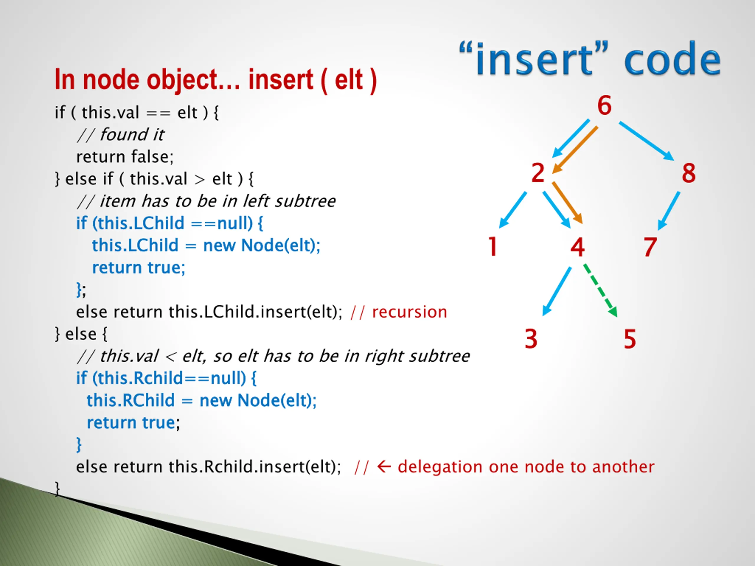 In node object insert ( elt ) if ( this.val == elt ) { } else if ( this.val > elt ) { } else { } 6 6 // found it return false; 2 2 8 8 // item has to be in left subtree if ( this.LChild return true; } }; ; else return this.LChild.insert(elt); // recursion if (this.LChild this.LChild = new Node( return true; this.LChild ==null) { ==null) { = new Node(elt 1 1 4 4 7 7 elt); ); 5 5 3 3 // this.val < elt, so elt has to be in right subtree if ( this.RChild return true } } else return this.Rchild.insert(elt); // delegation one node to another if (this.Rchild this.RChild = new Node( return true; ; this.Rchild==null) { ==null) { = new Node(elt elt); );