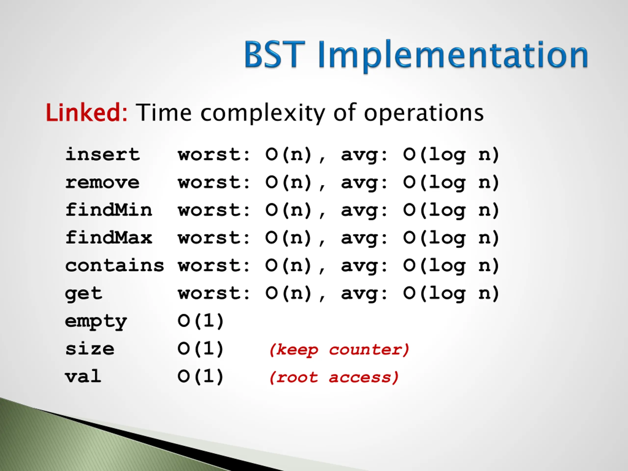 Linked: Linked: Time complexity of operations insert worst: O(n), avg: O(log n) remove worst: O(n), avg: O(log n) findMin worst: O(n), avg: O(log n) findMax worst: O(n), avg: O(log n) contains worst: O(n), avg: O(log n) get worst: O(n), avg: O(log n) empty O(1) size O(1) (keep counter) val O(1) (root access)
