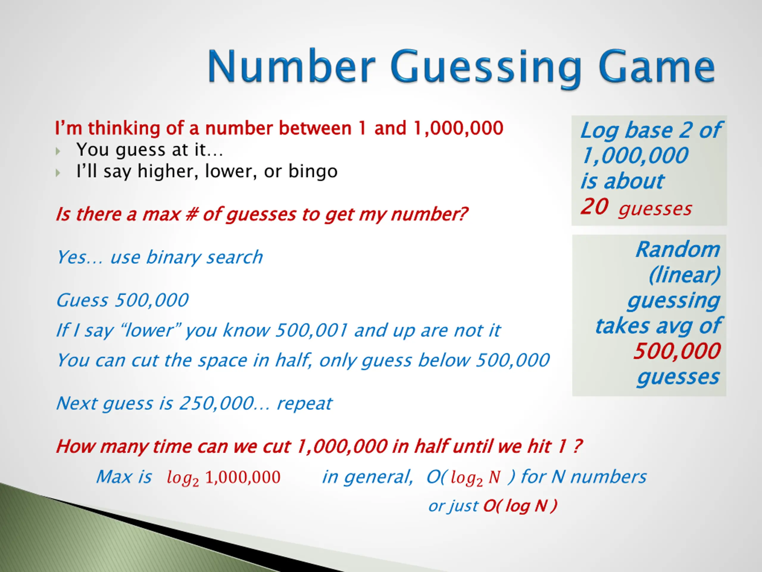Log base 2 of 1,000,000 is about 20 guesses Random (linear) guessing takes avg 500,000 guesses Log base 2 of 1,000,000 is about 20 Random (linear) guessing takes 500,000 guesses I m thinking of a number between 1 and 1,000,000 You guess at it I ll say higher, lower, or bingo I m thinking of a number between 1 and 1,000,000 Is there a max # of guesses to get my number? Is there a max # of guesses to get my number? Yes use binary search Guess 500,000 If I say lower you know 500,001 and up are not it You can cut the space in half, only guess below 500,000 avg of of Next guess is 250,000 repeat How Max is ???2 1,000,000 in general, O( ???2 ? ) for N numbers How many time can we cut 1,000,000 in half until we hit many time can we cut 1,000,000 in half until we hit 1 ? 1 ? or just O( log N ) O( log N )